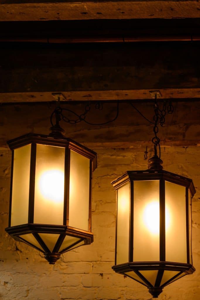 Very large and heavy 1920s brass lanterns with frosted glass and an integral hook at the top.