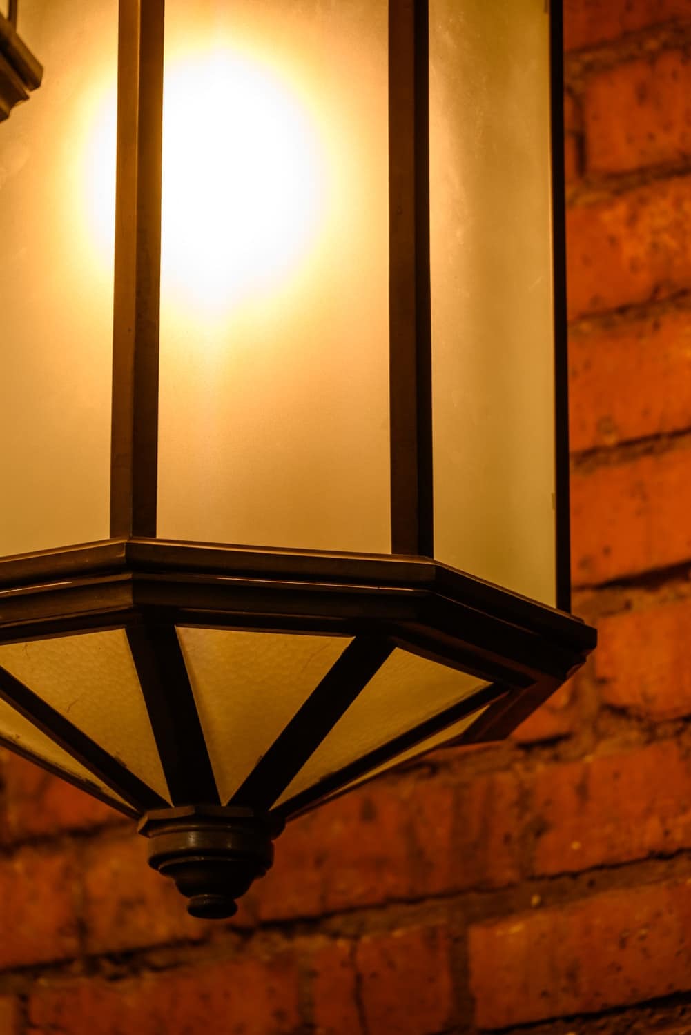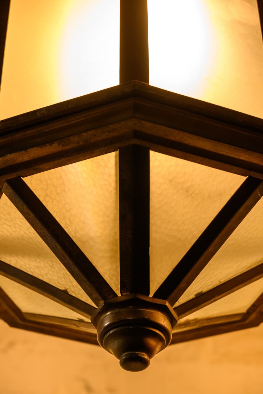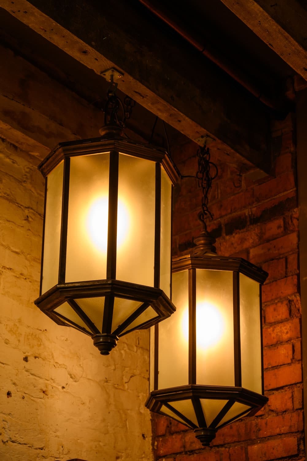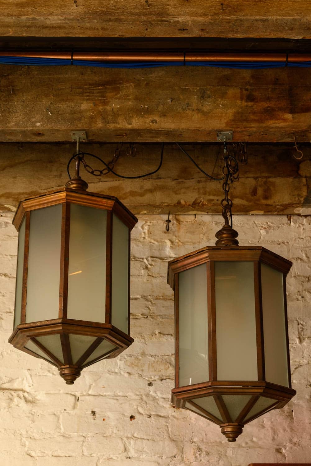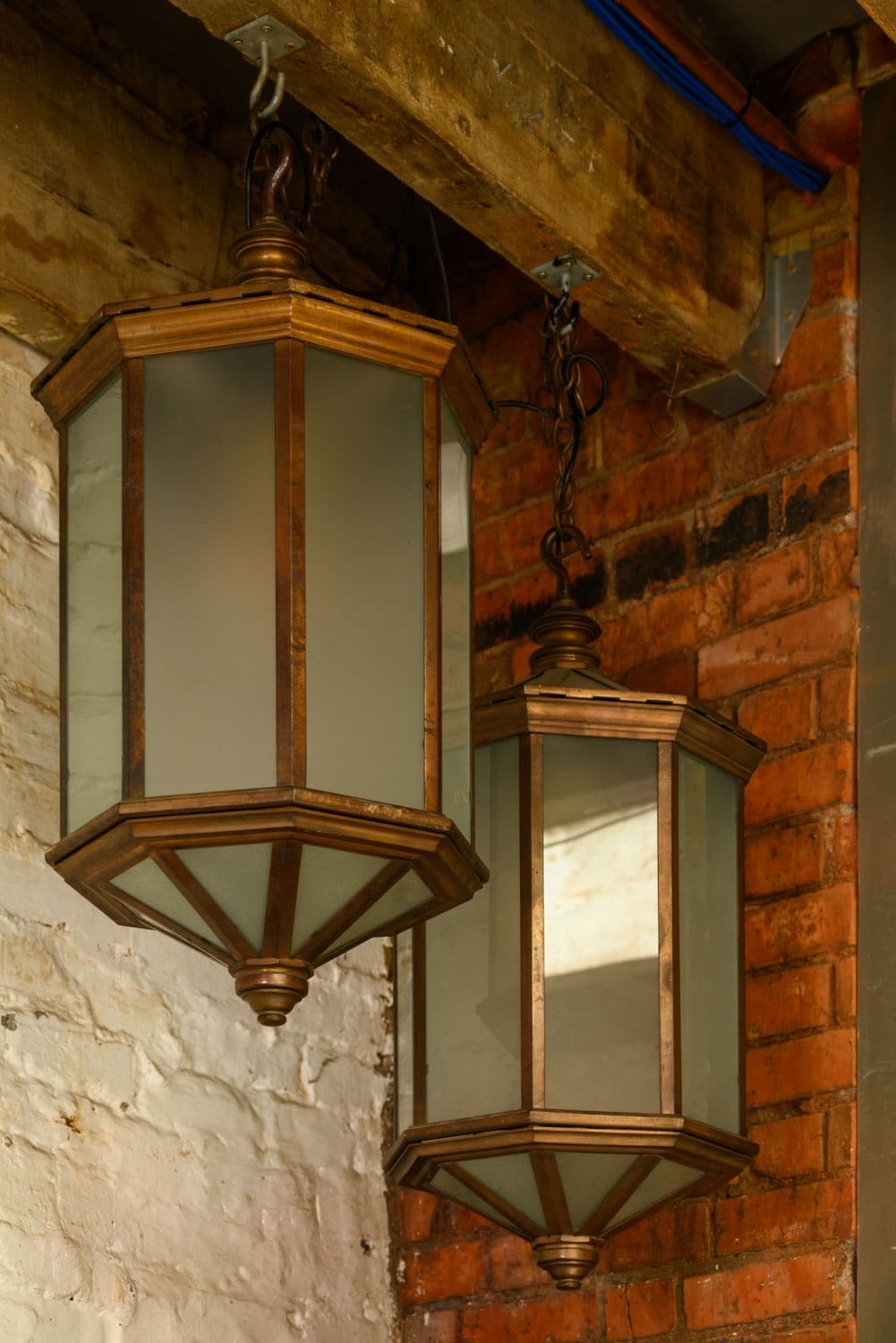 Very large and heavy 1920s brass lanterns with frosted glass and an integral hook at the top.