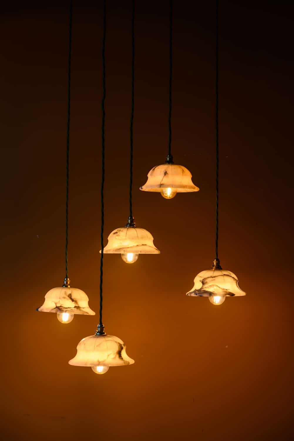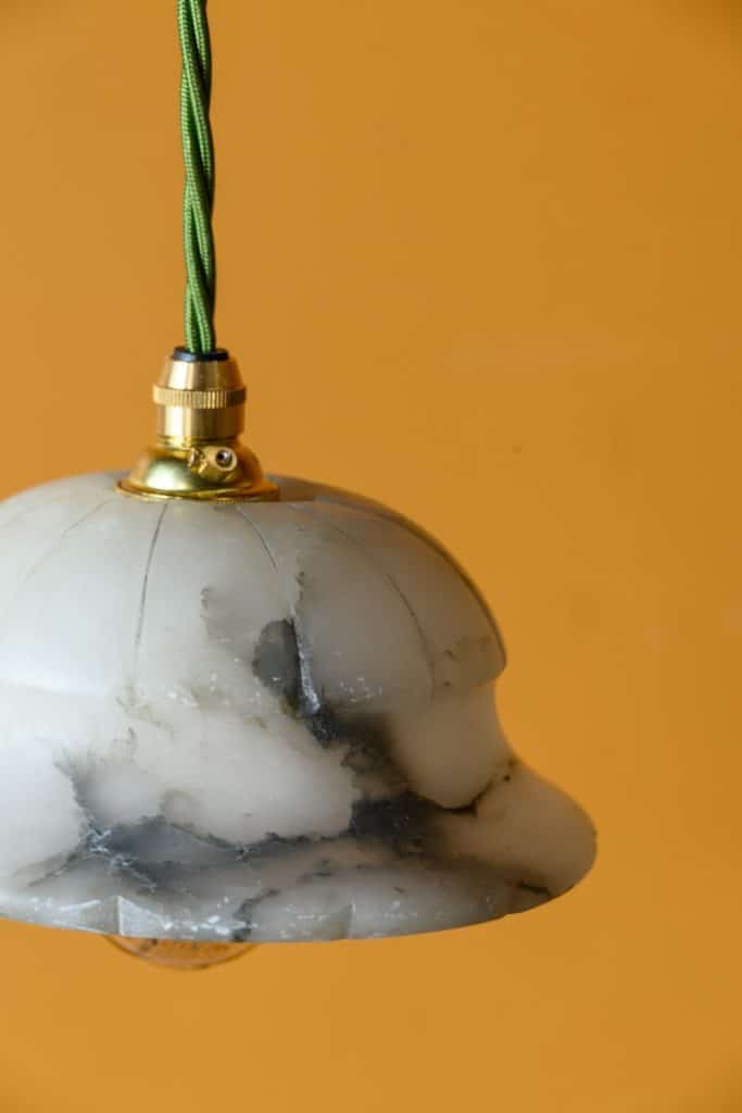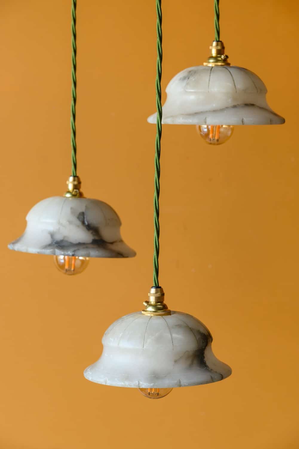 Small alabaster pendant lights, early 20th Century, with groove decoration in a very lovely shape.