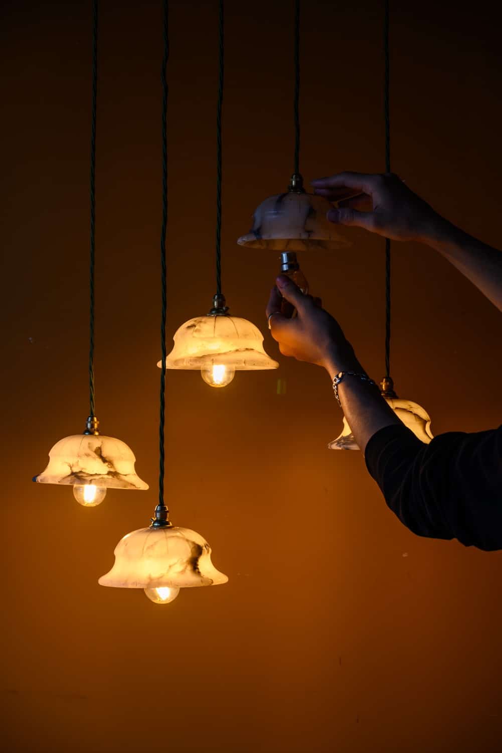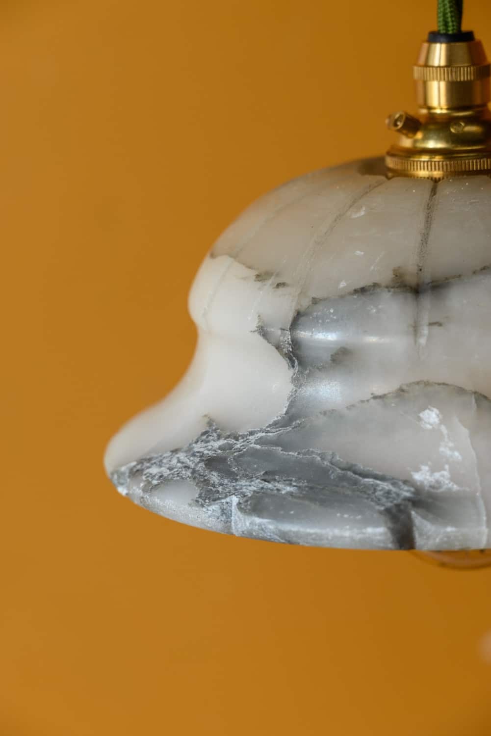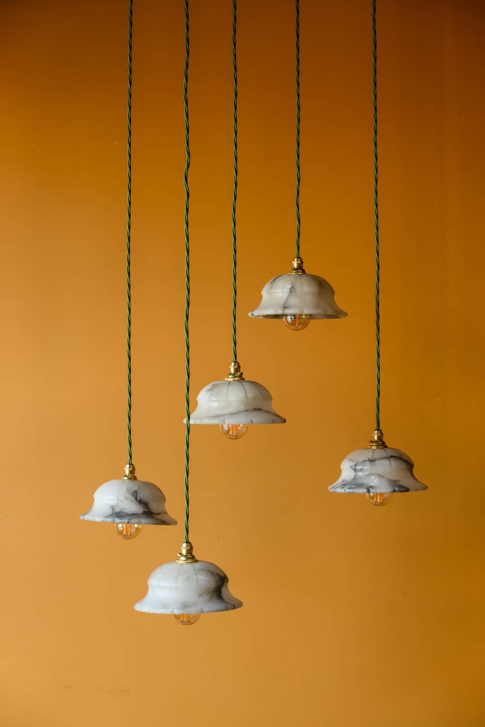 Small alabaster pendant lights, early 20th Century, with groove decoration in a very lovely shape.