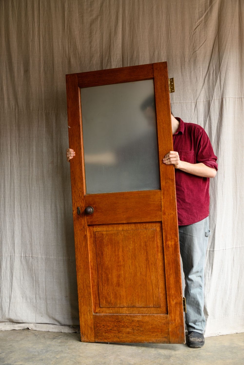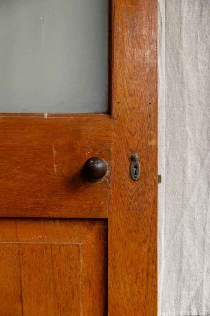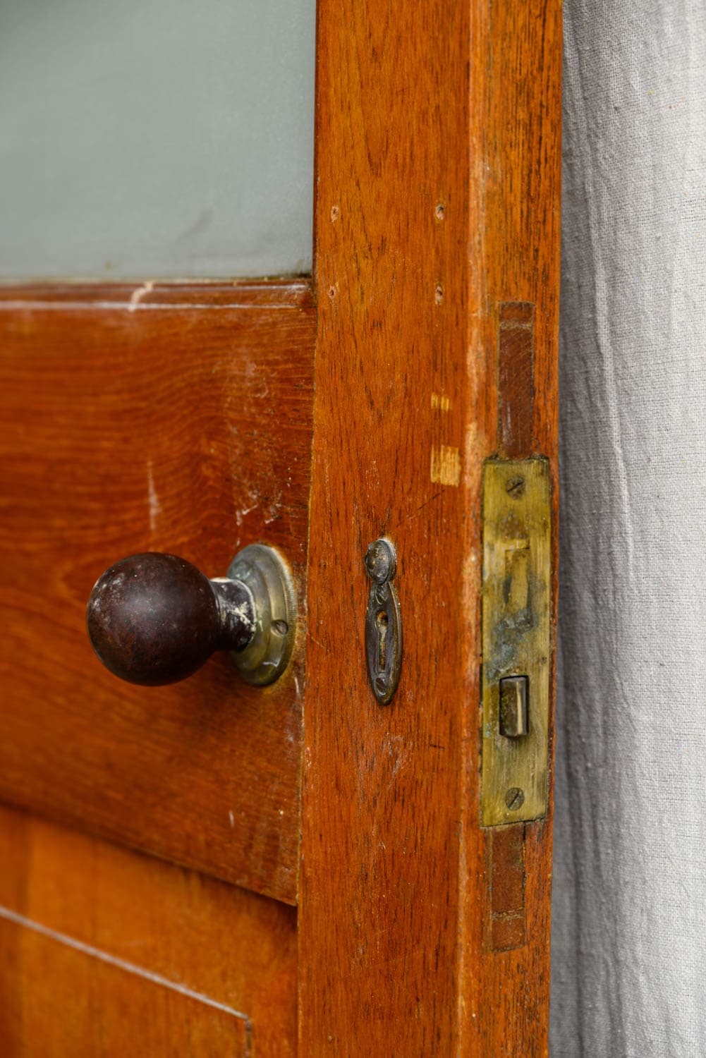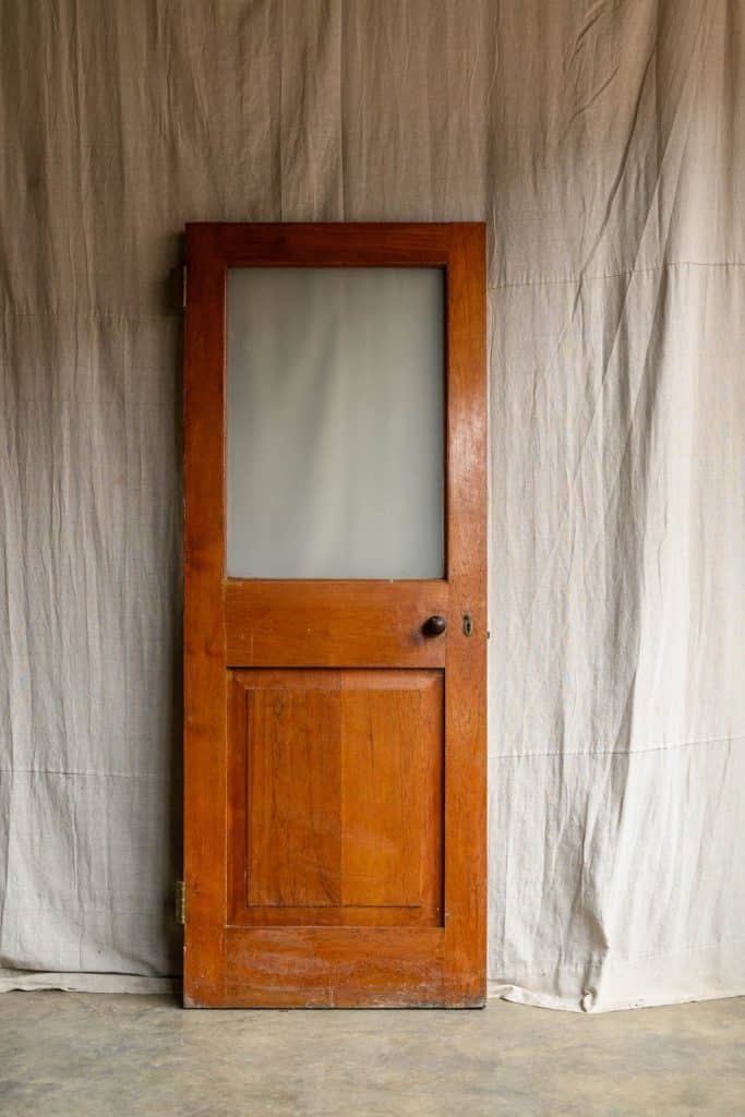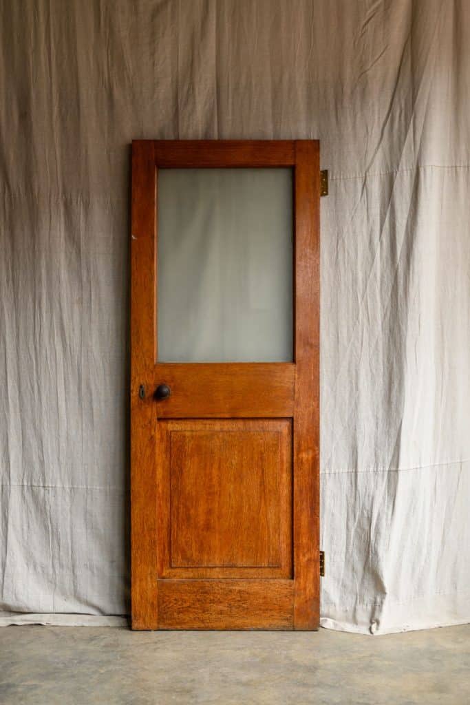Hardwood office door, half-glazed with a frosted glass panel.
