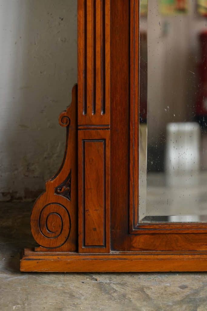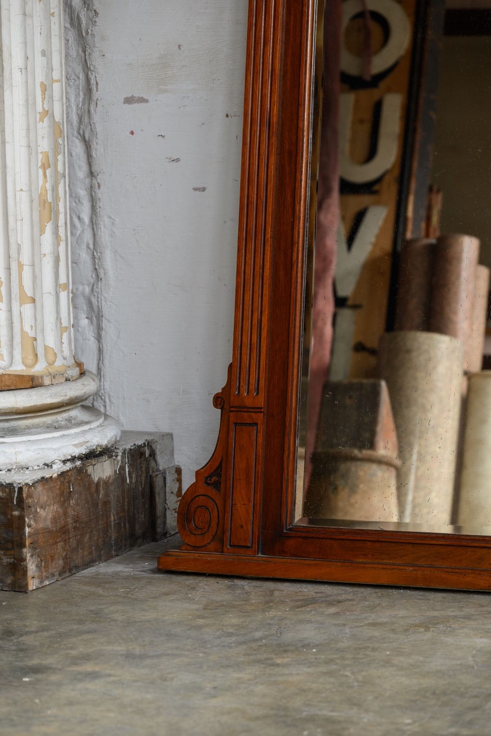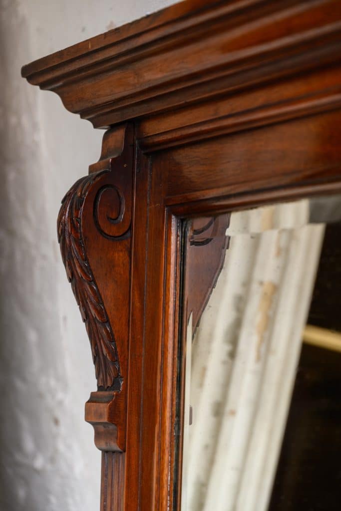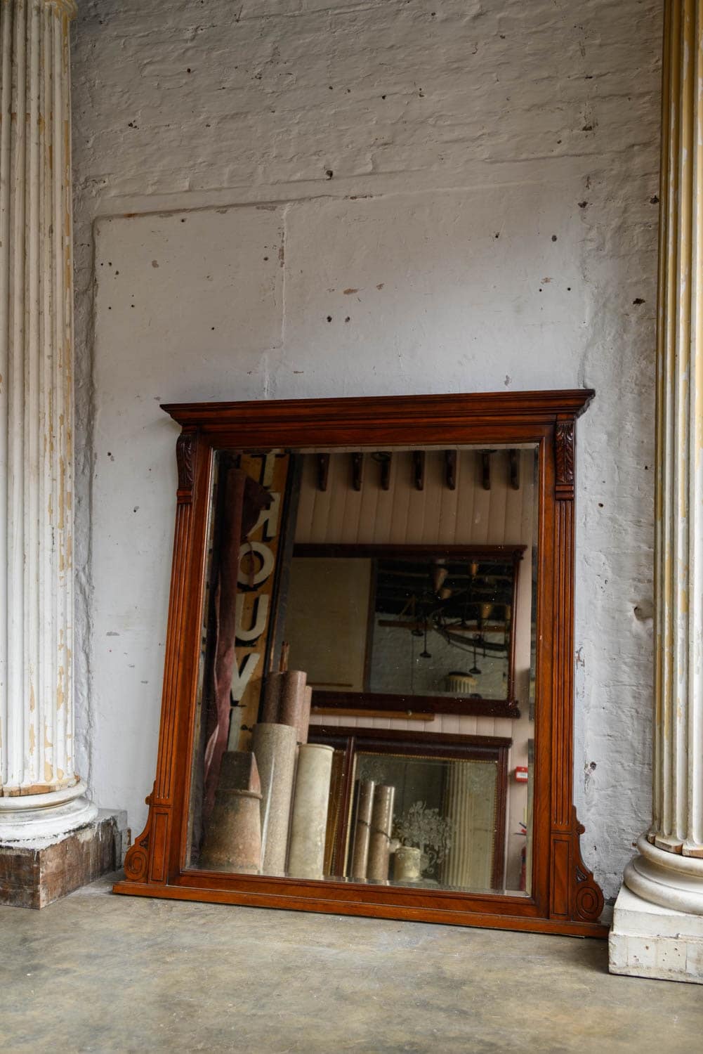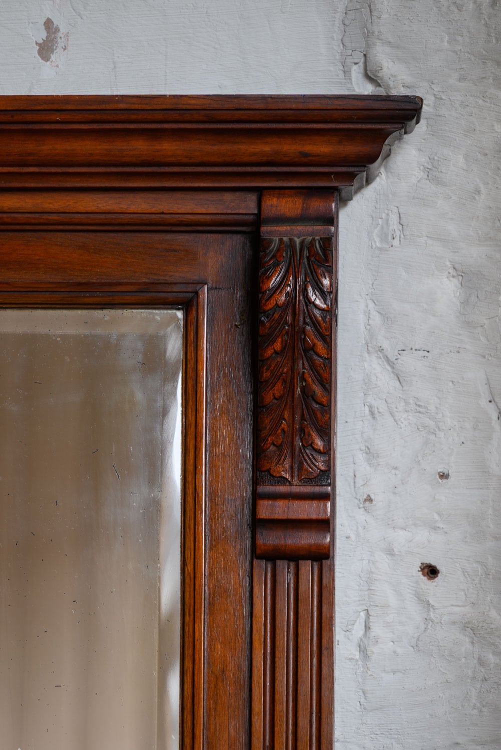 Hardwood overmantel mirror of good proportions, with handsome decoration and bevelled glass.
