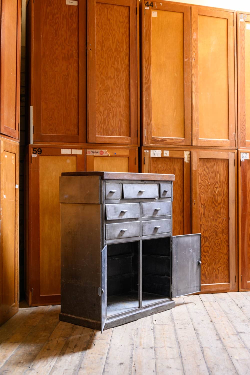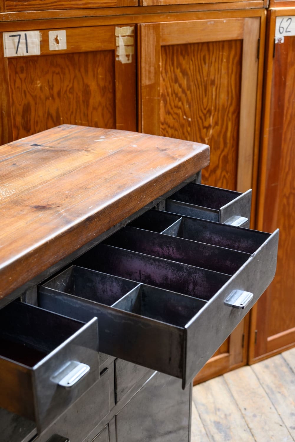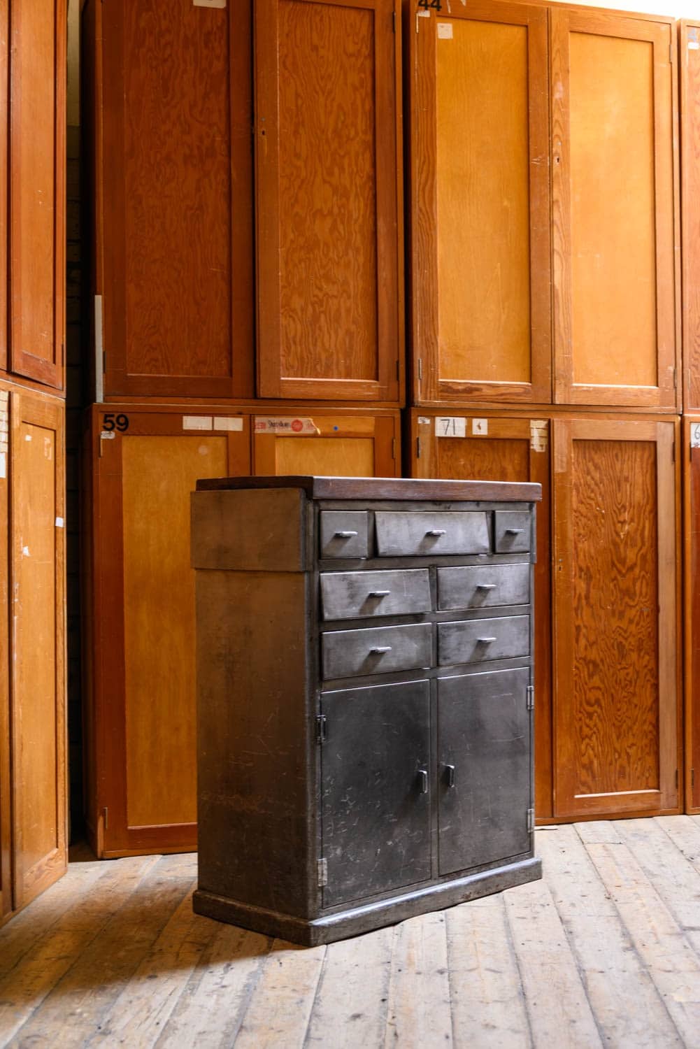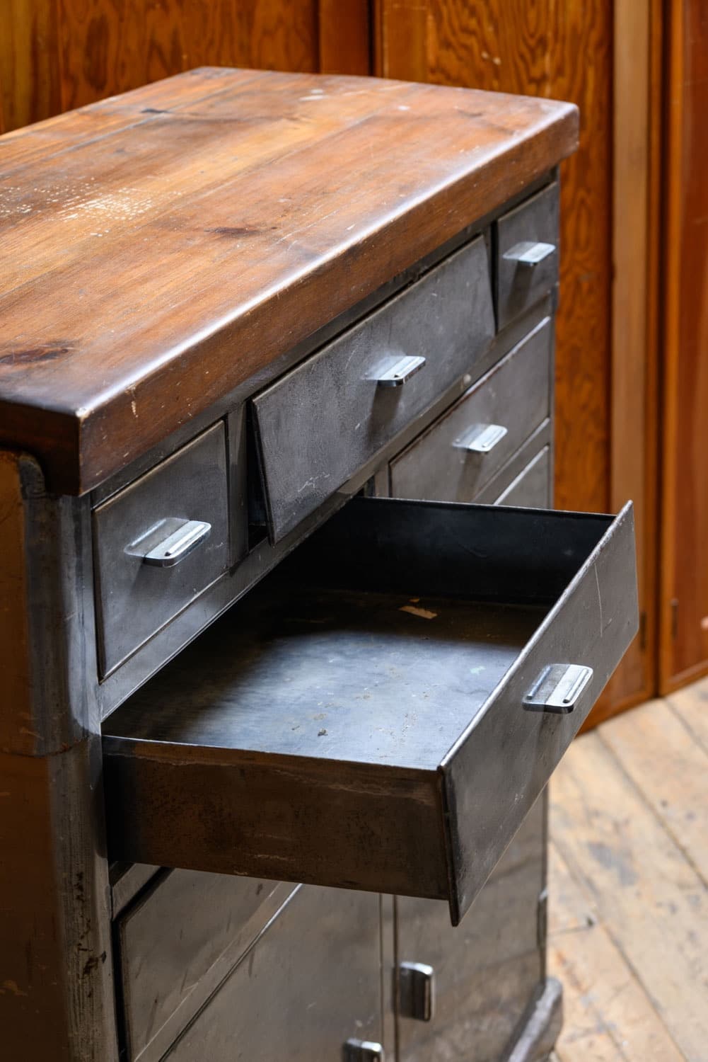 Modern-made industrial steel storage unit with wooden top, with seven drawers and a cupboard.
