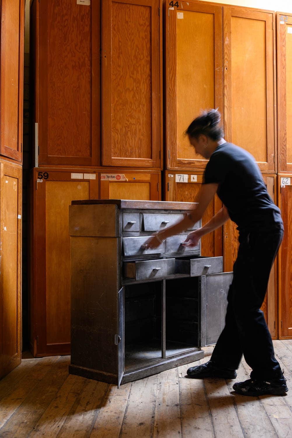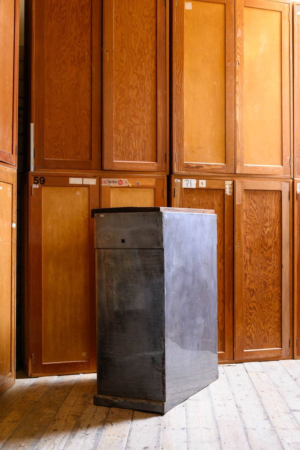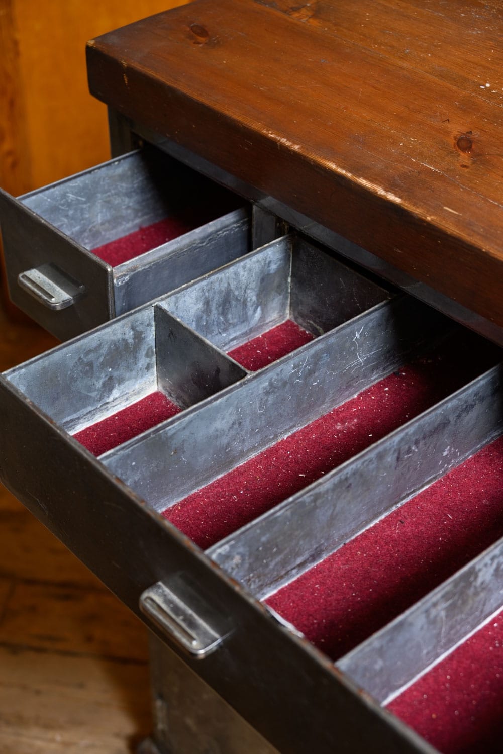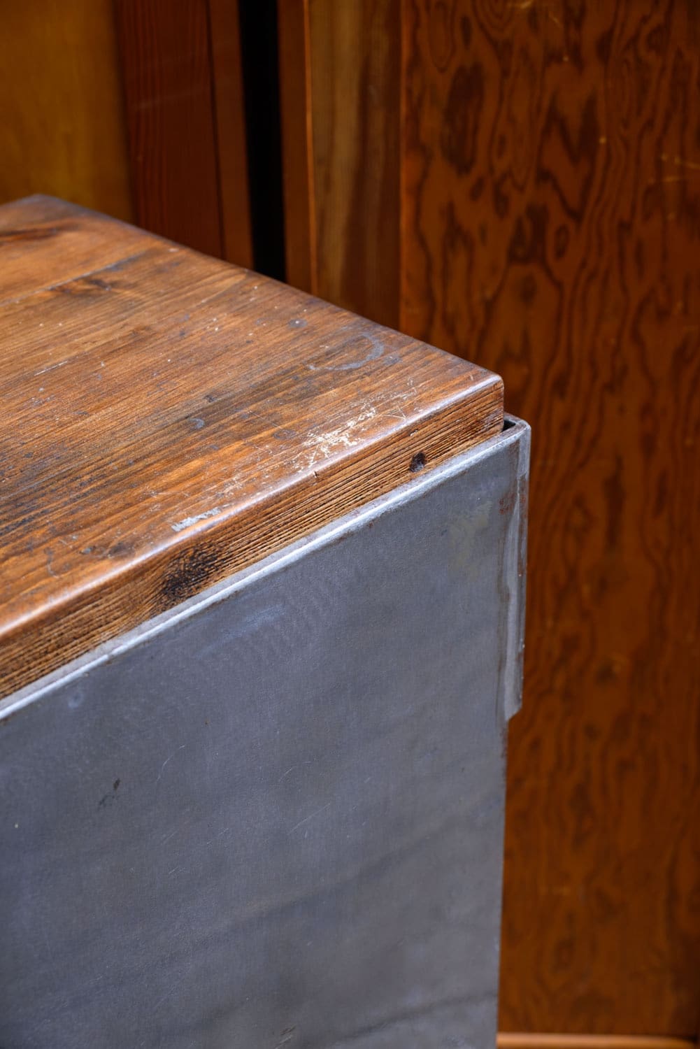 Modern-made industrial steel storage unit with wooden top, with seven drawers and a cupboard.