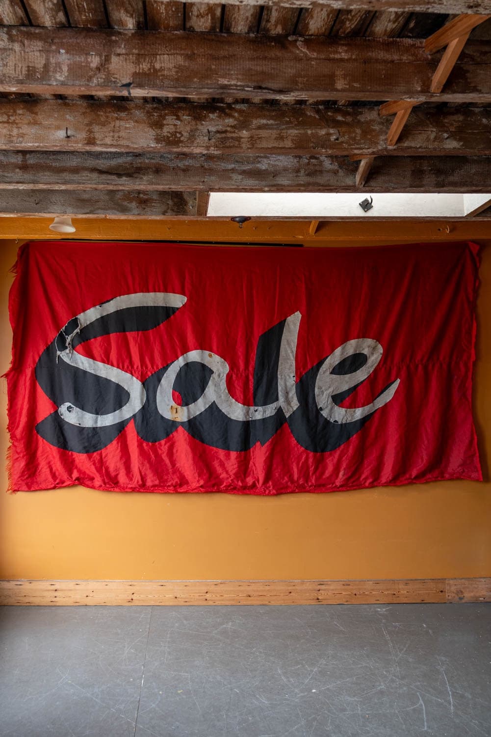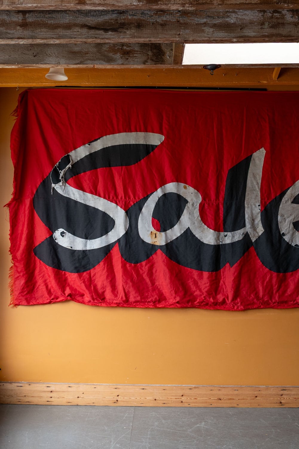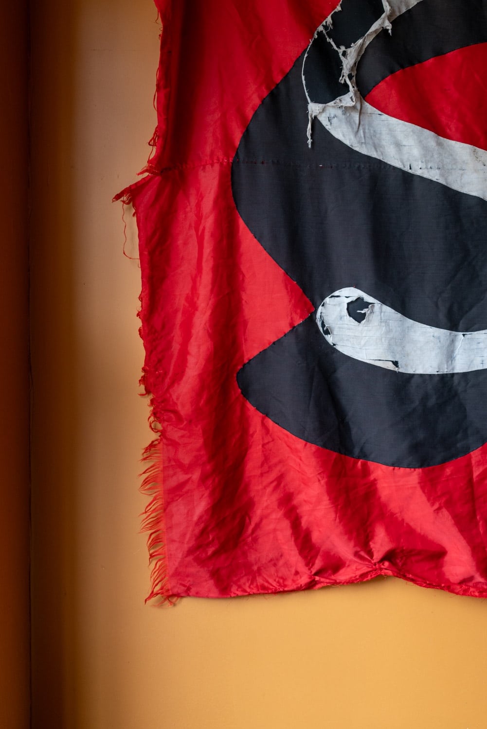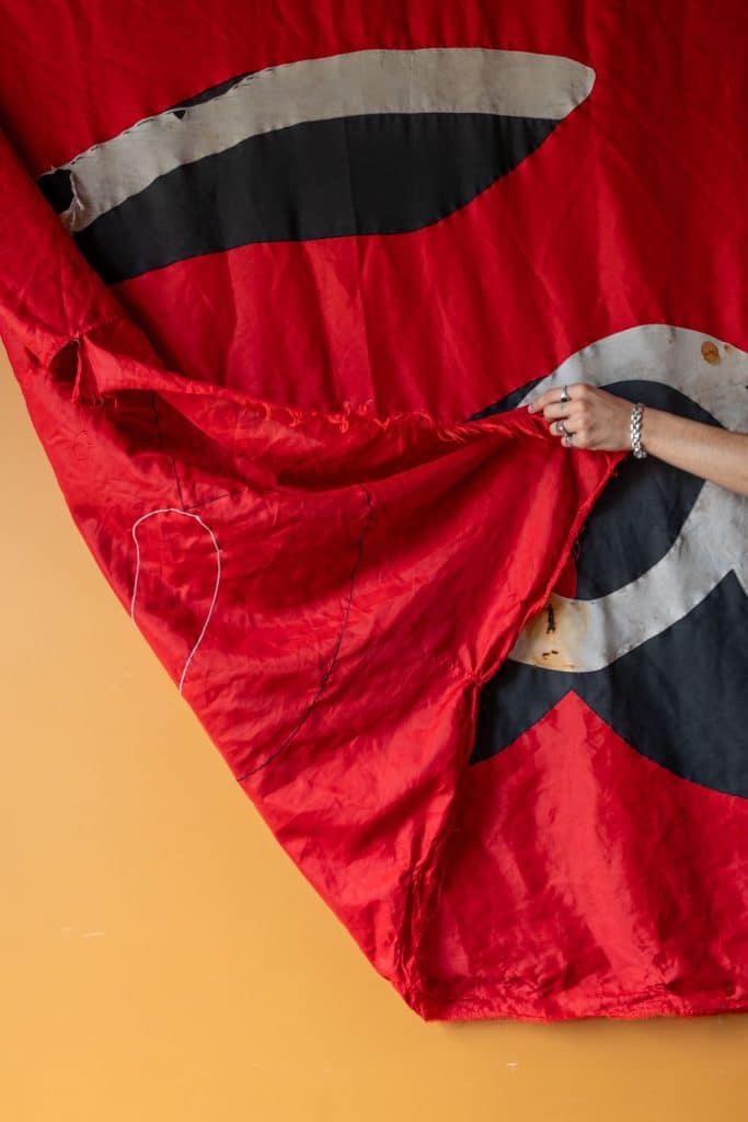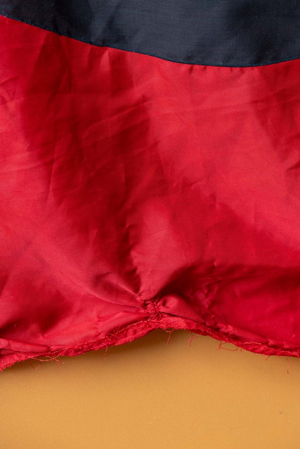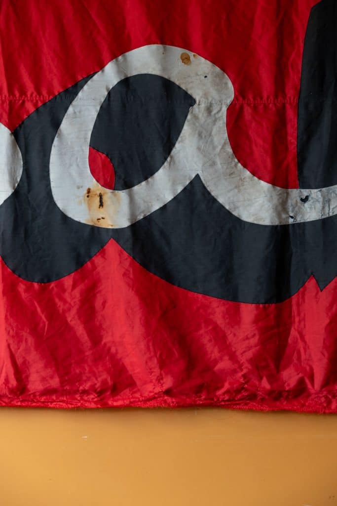 Vibrant red background with white cursive font and bold drop shadow effect. Stitched nylon/polyester.