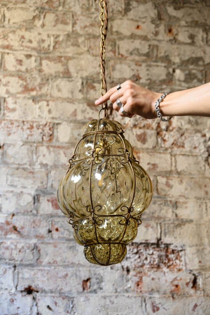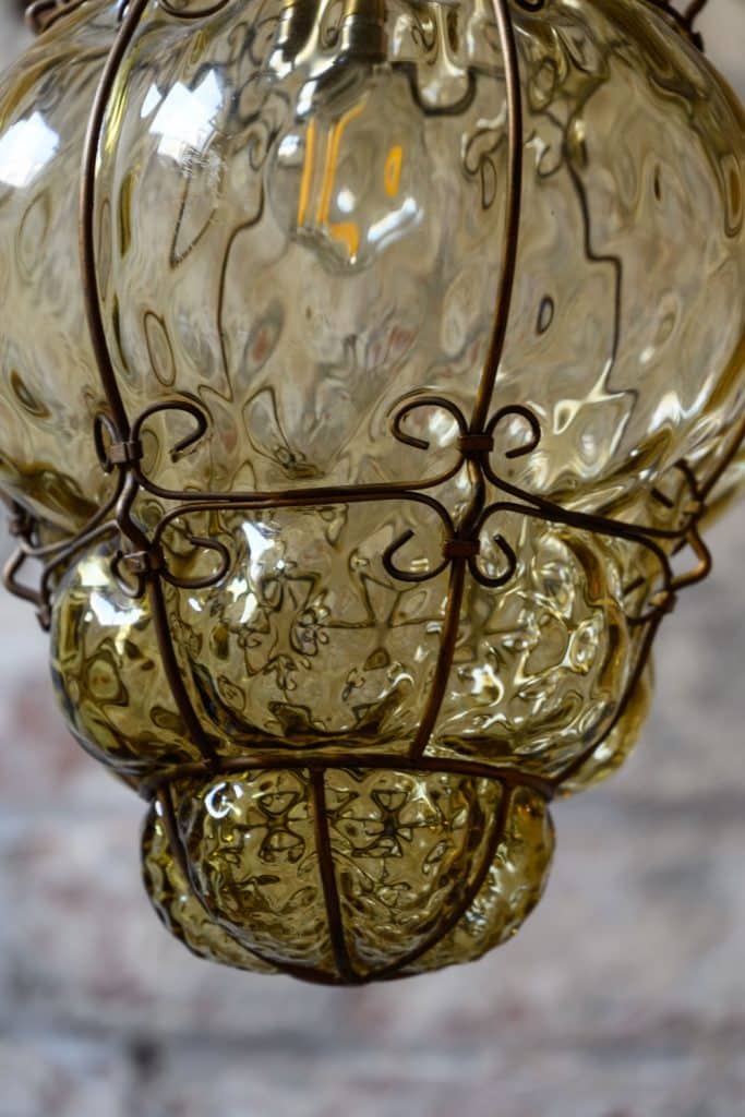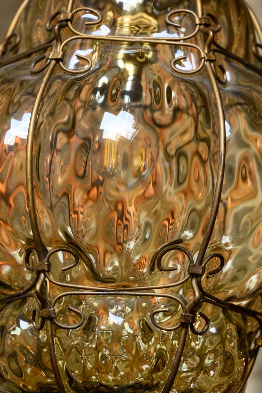 Large yellow murano bubble lantern, formed by blowing glass within a metal cagework.