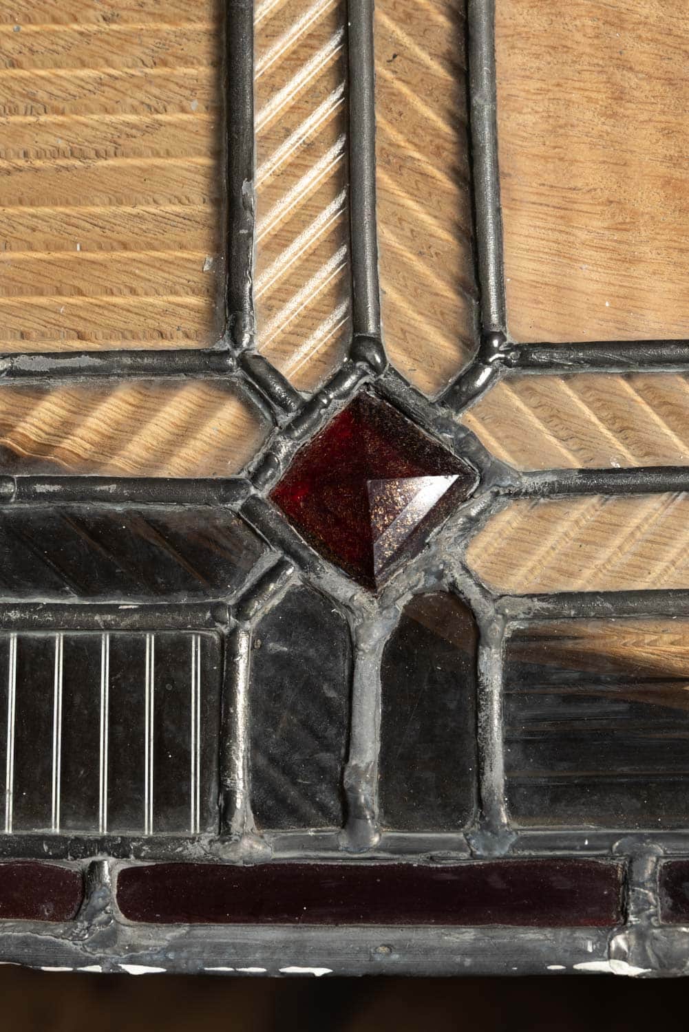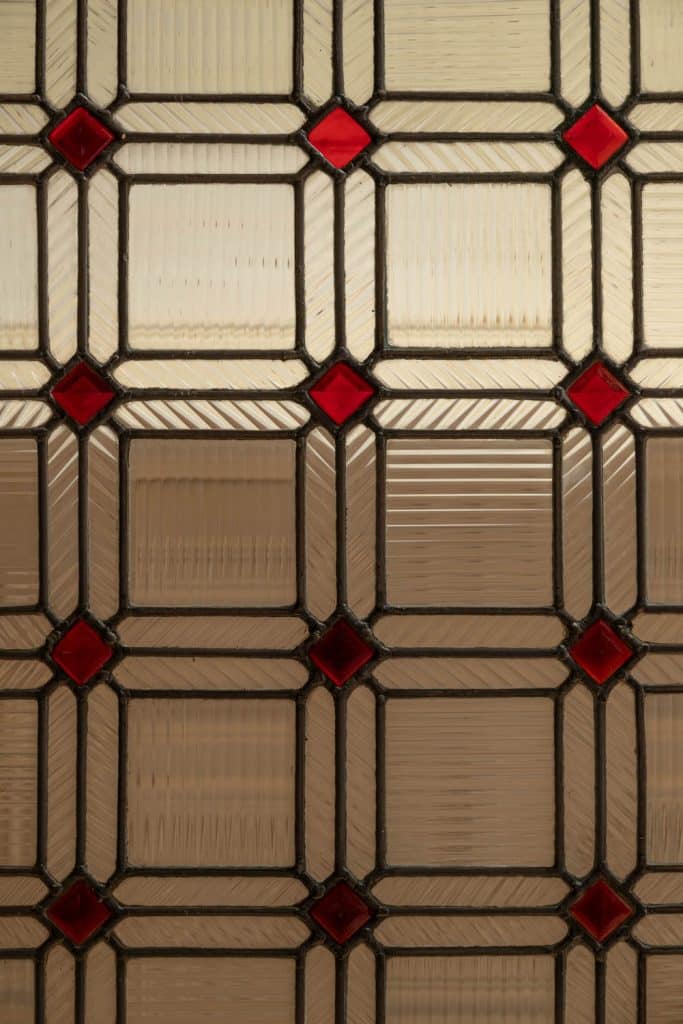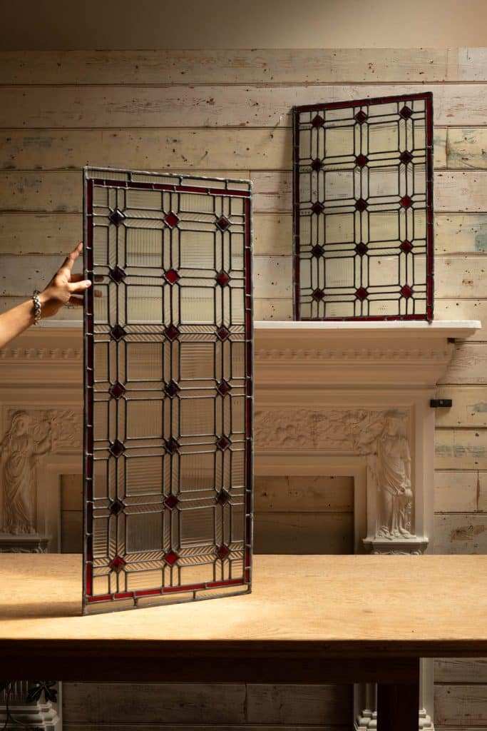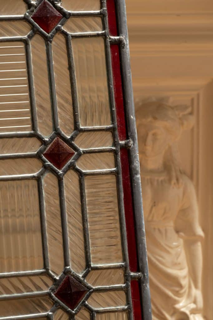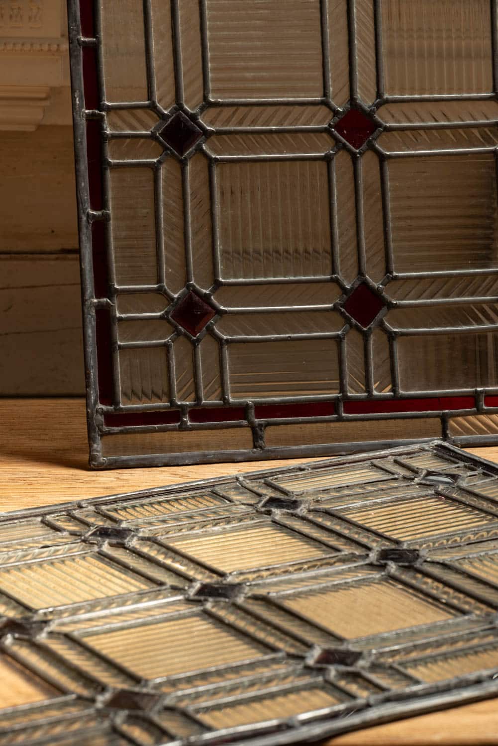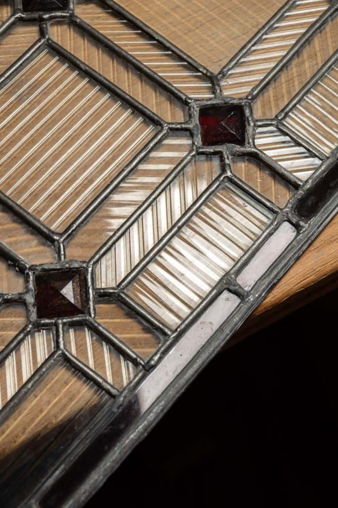 Reclaimed lead lights with reeded semi transparent glass.