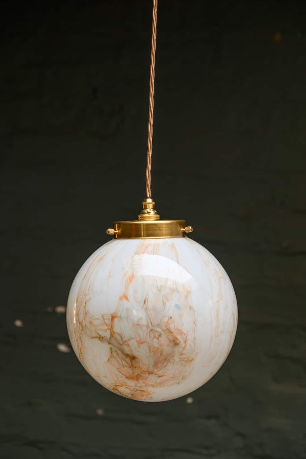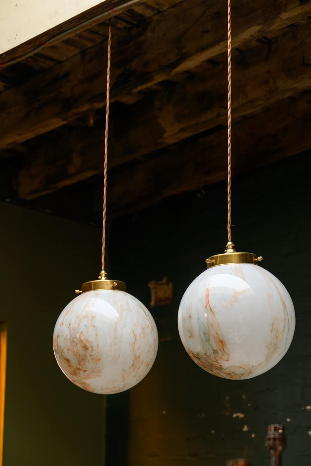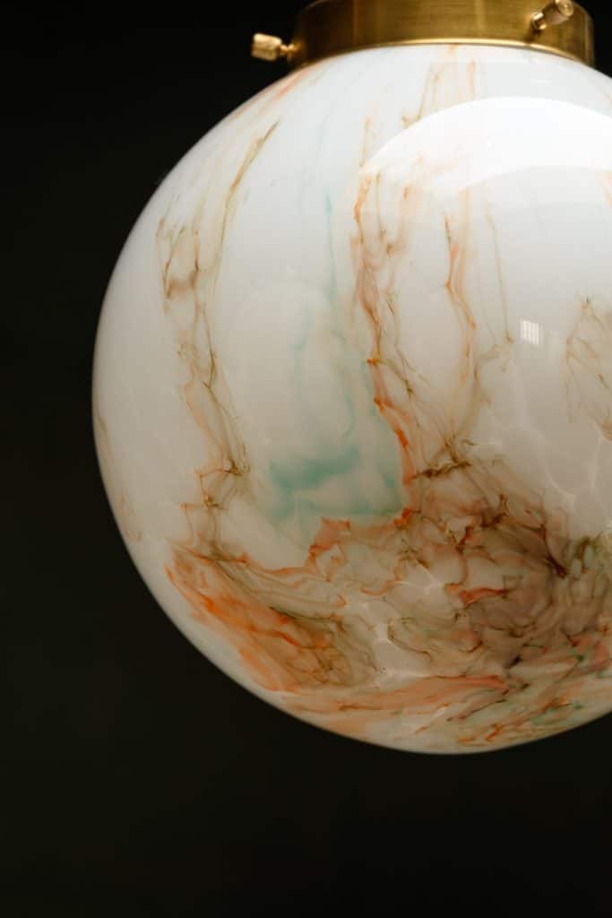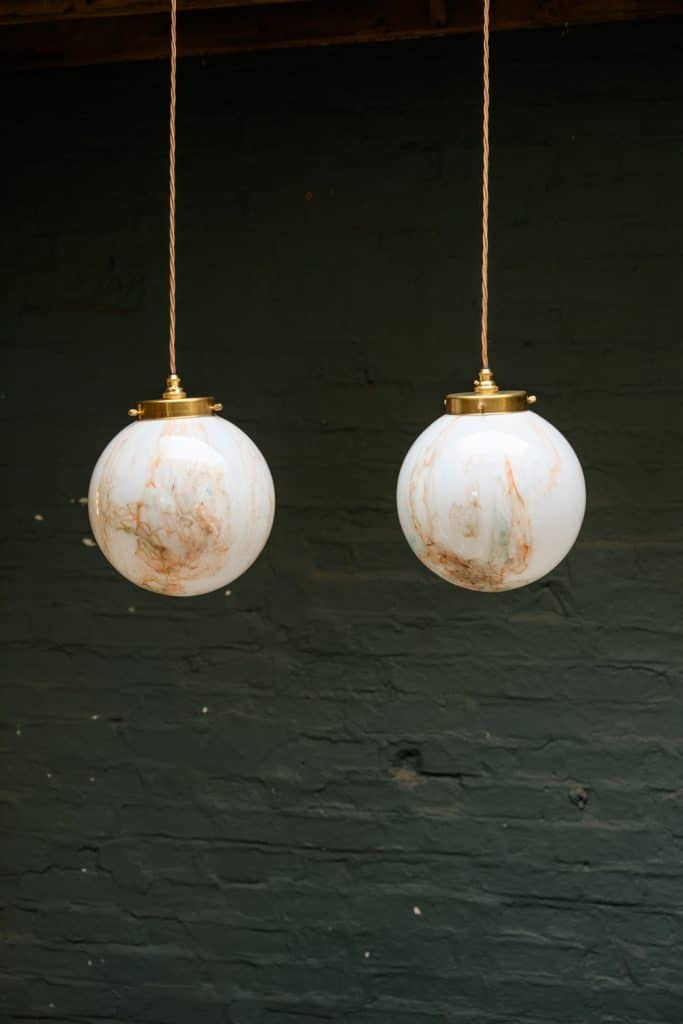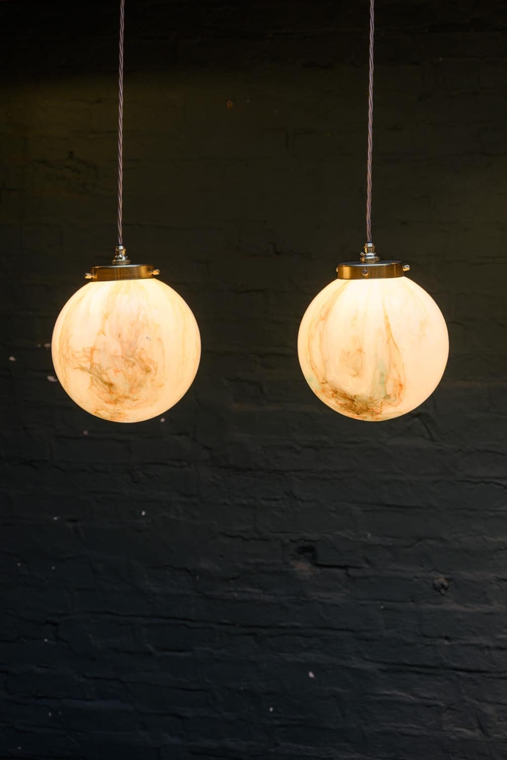 Two marbled opaline globe lights with orange and green swirls.