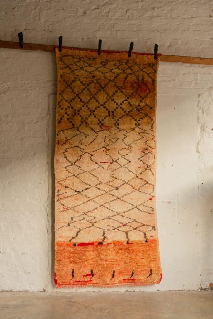 Colourful Moroccan narrow rug with abstracted Beni Ourain lattice pattern.