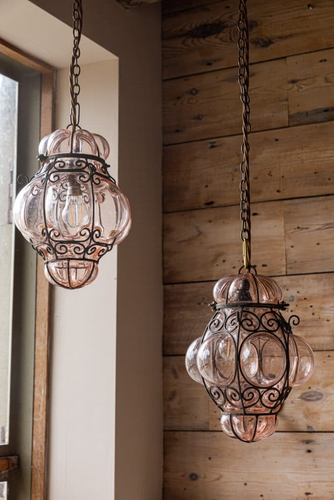 Rose-tinted blown glass lanterns with fine, scrolling ironwork cages.