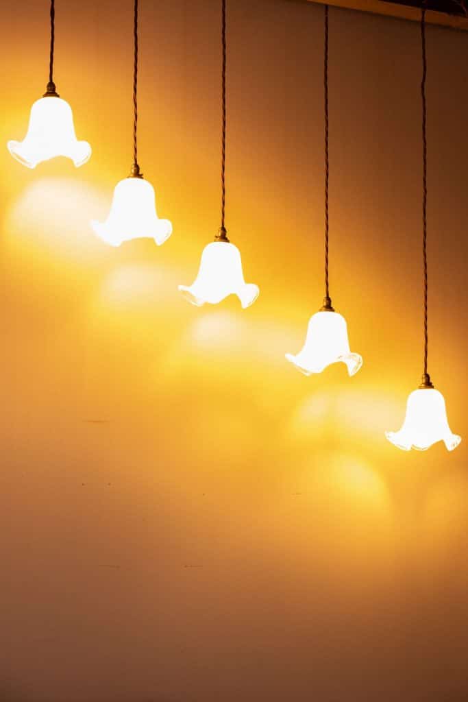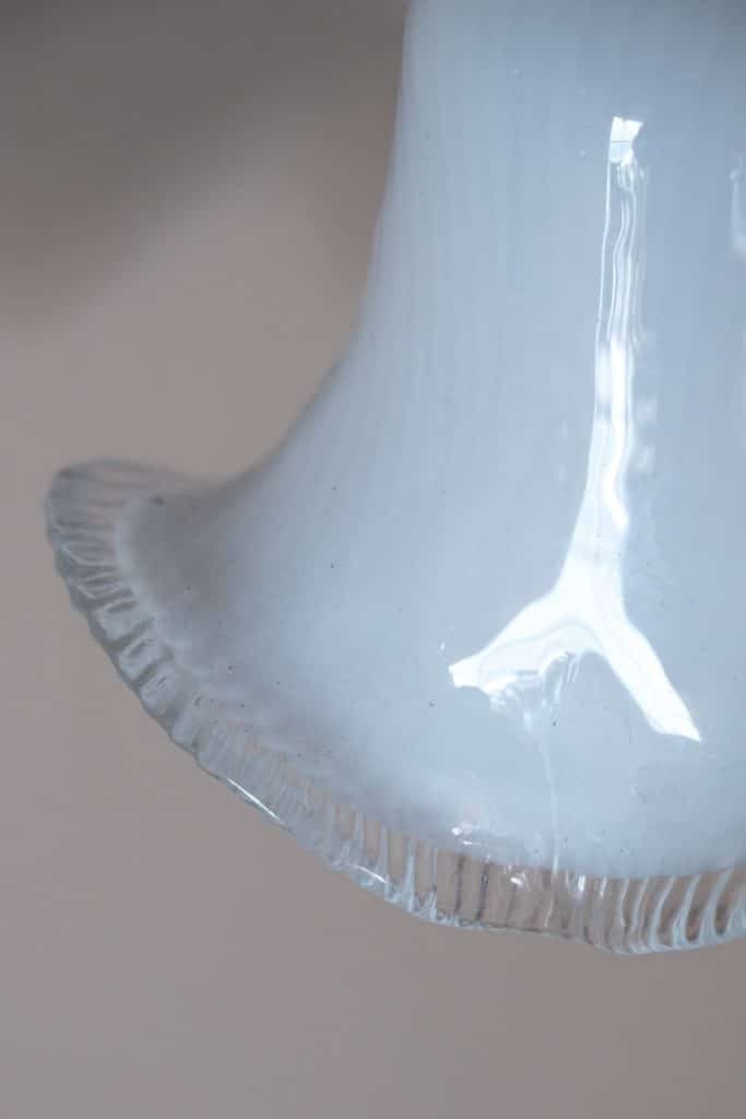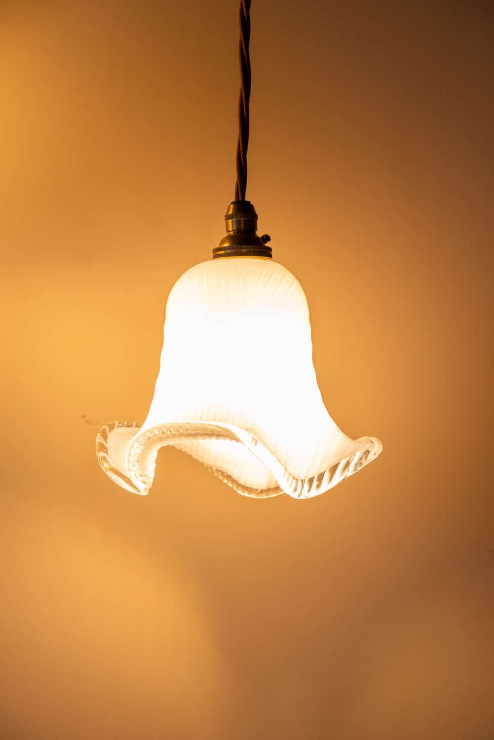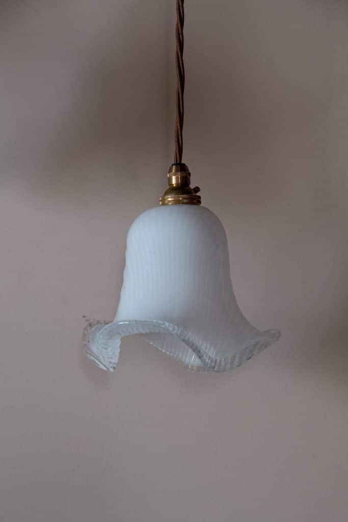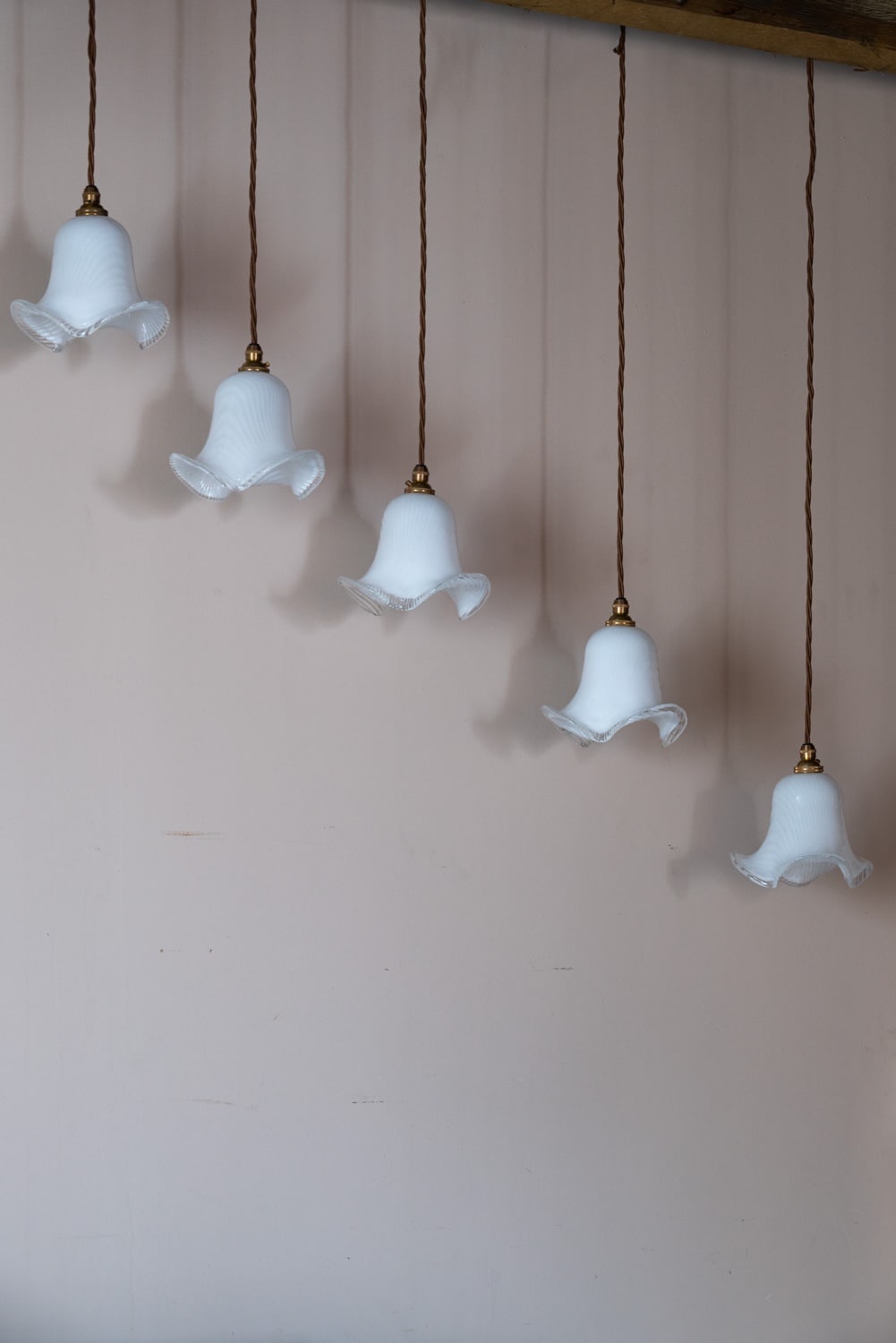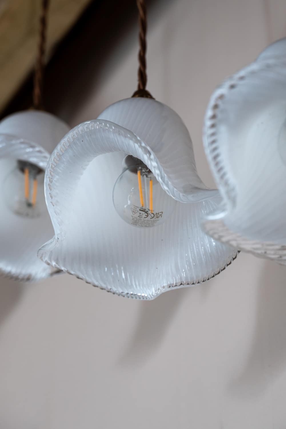 Wavy edged sweet Murano glass pendants with a rippled linear pattern.