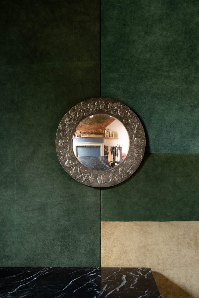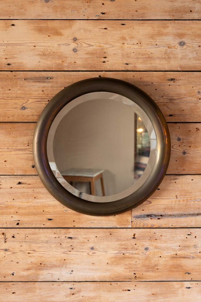 Large oak split framed overmantle mirror with heavily foxed original glass. Simple design with carved rosette details.