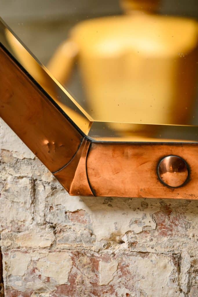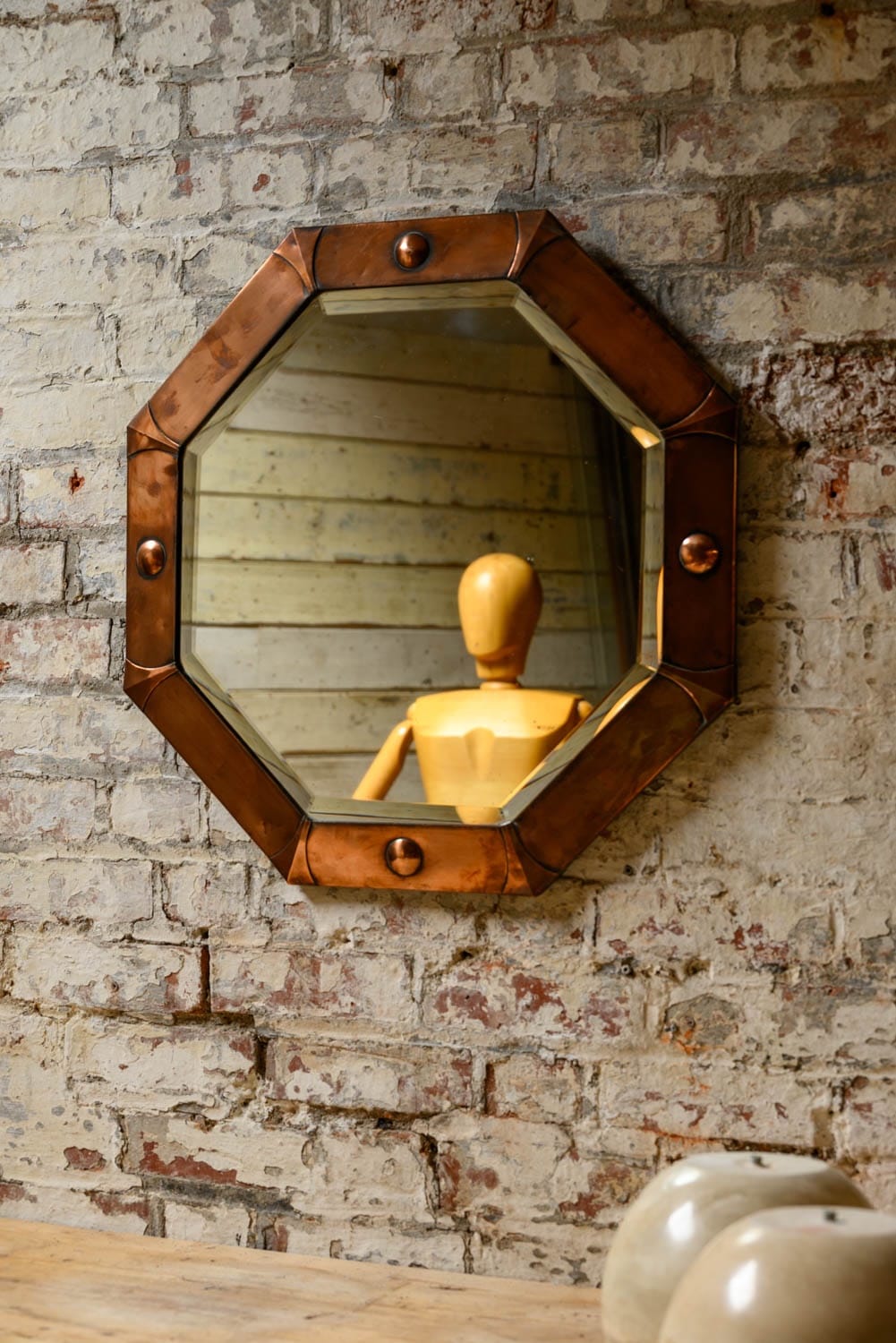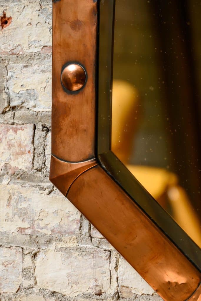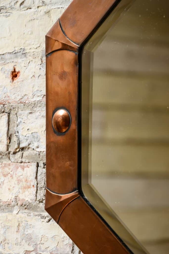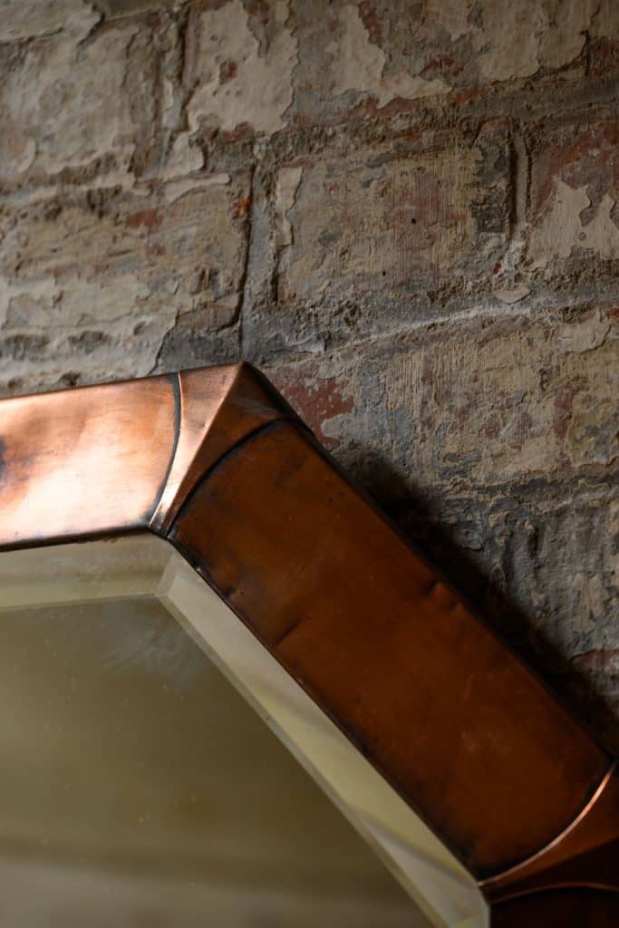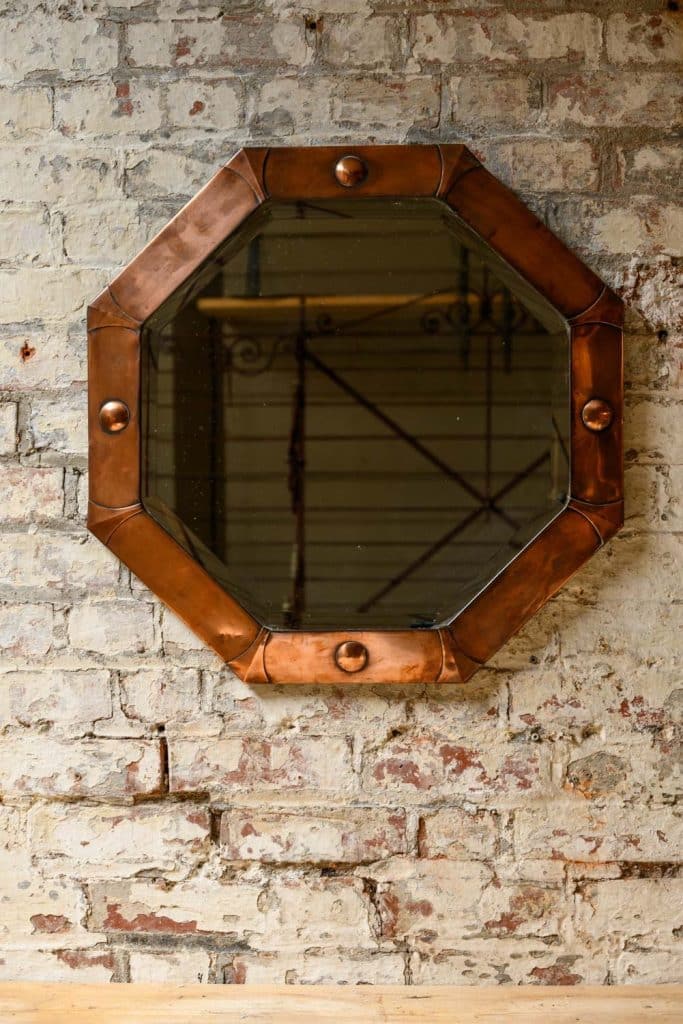 Octagonal mirror with bevelled glass and Arts and Crafts or Arts Deco copper frame.