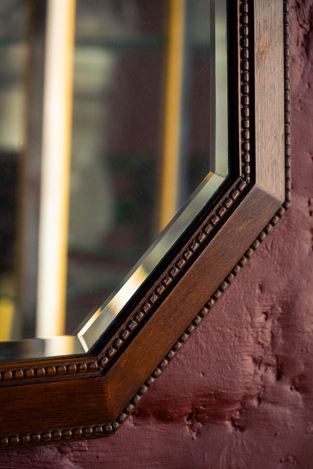 Octagonal oak mirror with beaded decoration and a bevelled plate.