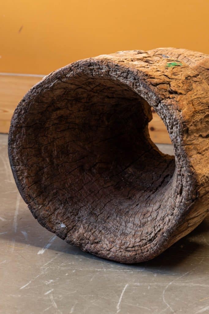 Hollowed wooden vessel with a sculptural, organic form – originally used as a mortar for husking grain, but has worn through.