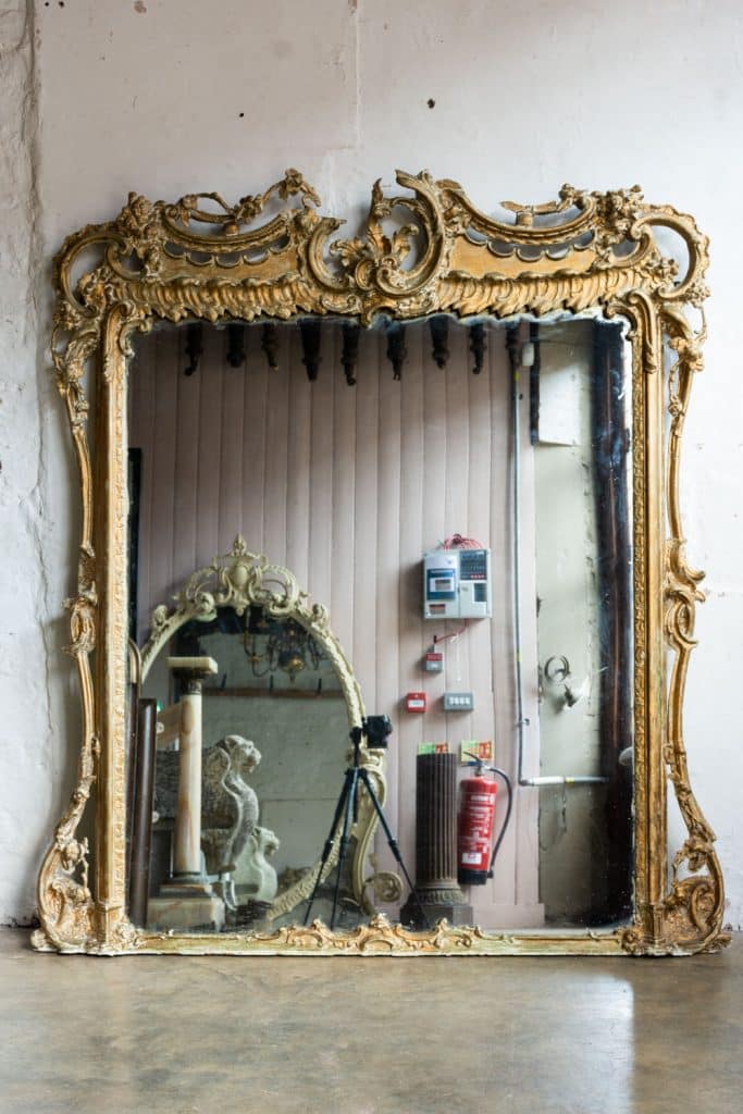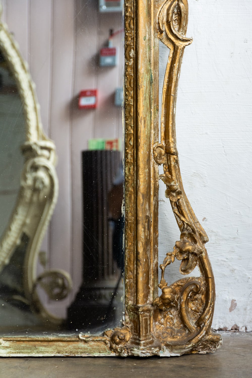 An ornate vintage overmantle mirror made with Rococo plasterwork in a patinated gold.A section from the top of the mirror is missing with wear and tear consistent with its age.Dimensions: H 1610mm, W 1330mm
