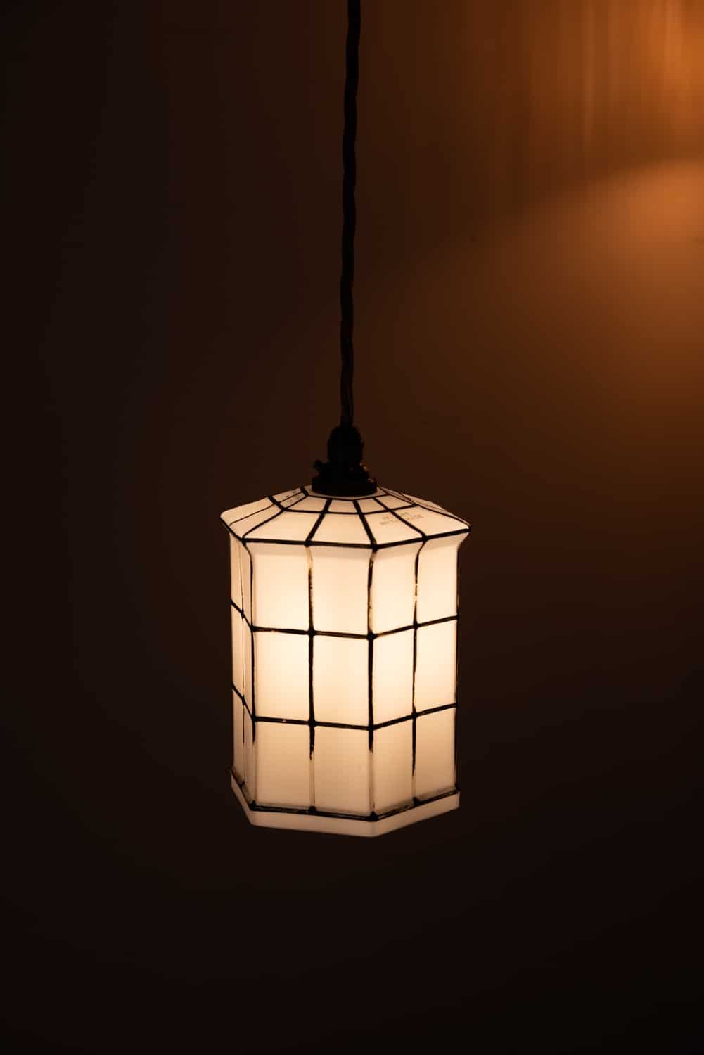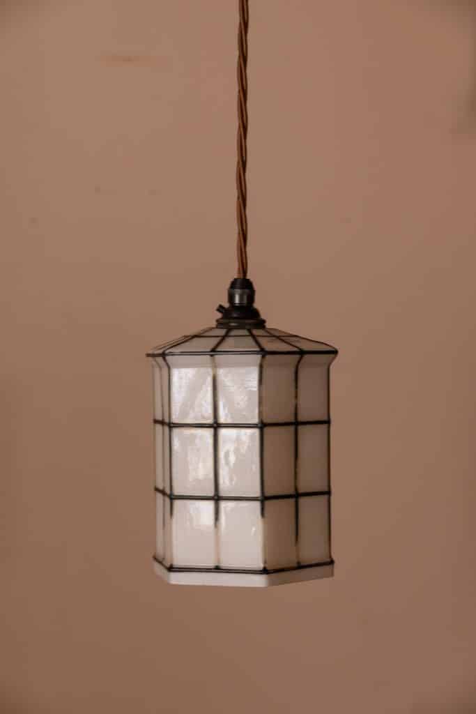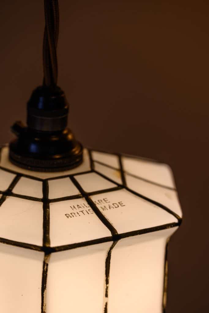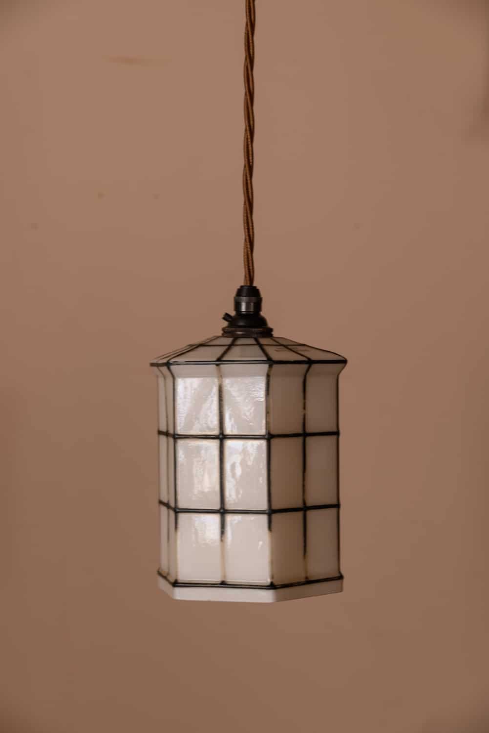 Opaline pendant by British maker Hailware, early 20th century, painted in the manner of a leaded lantern.