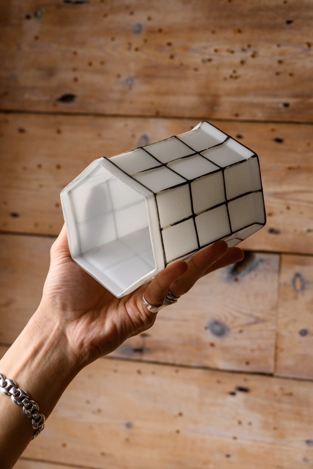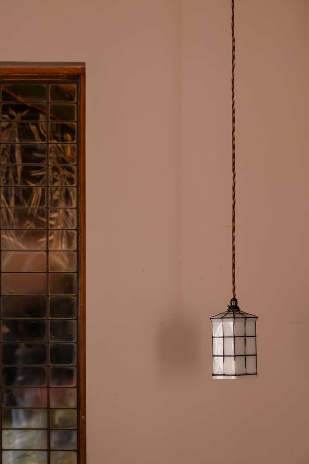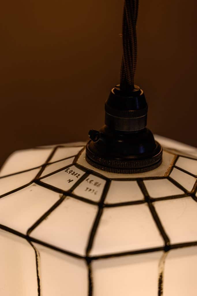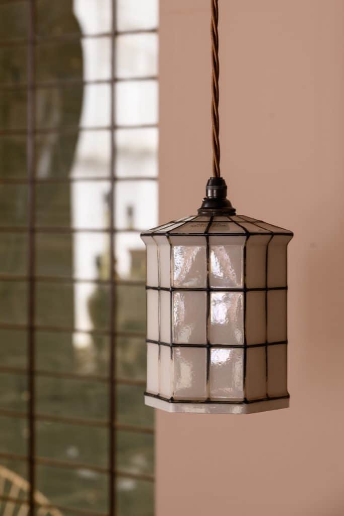 Opaline pendant by British maker Hailware, early 20th century, painted in the manner of a leaded lantern.