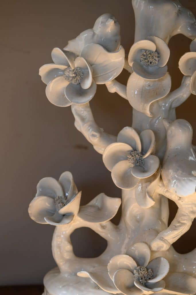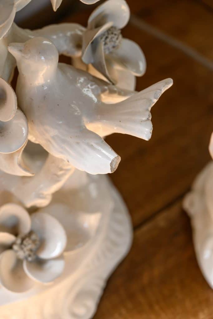 Some minor chips and lossage to extremities. The top left bird on one lamp is missing its tail, visible only from behind.