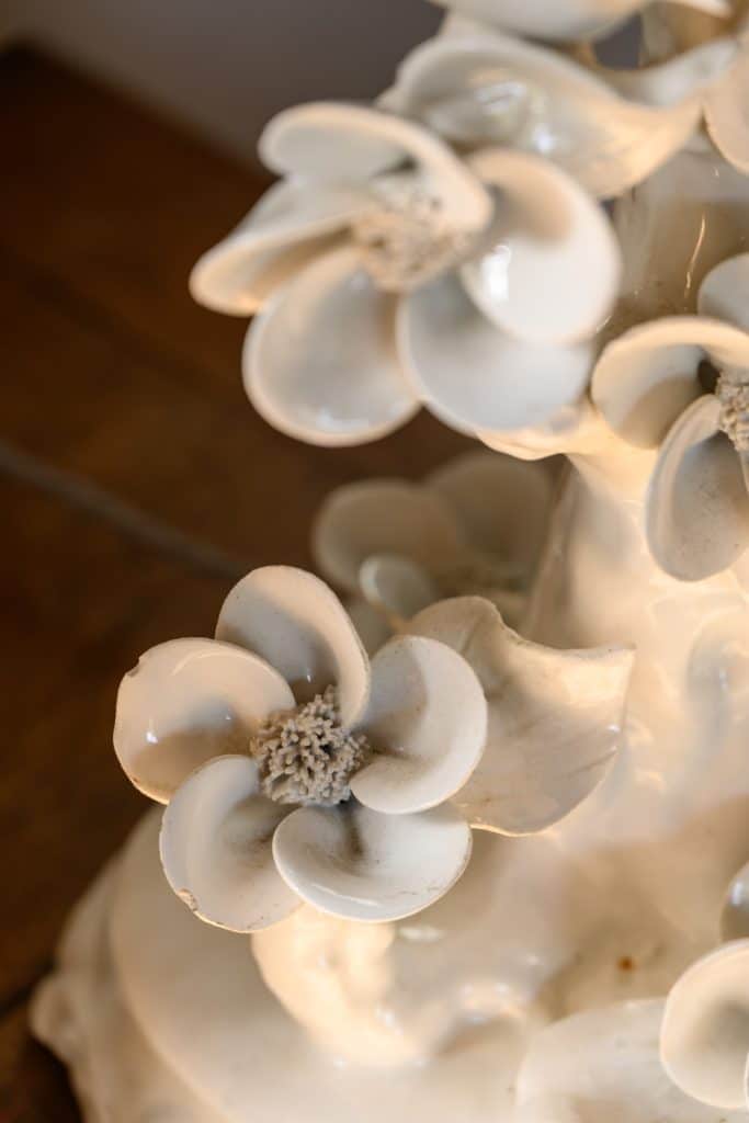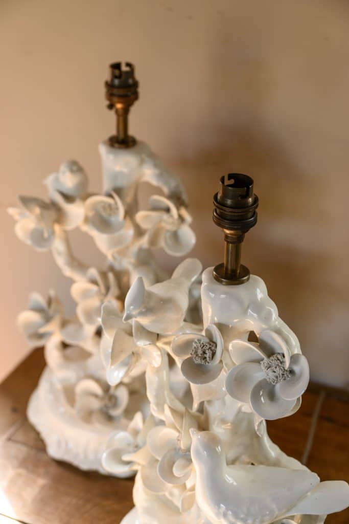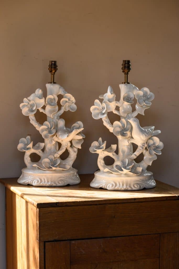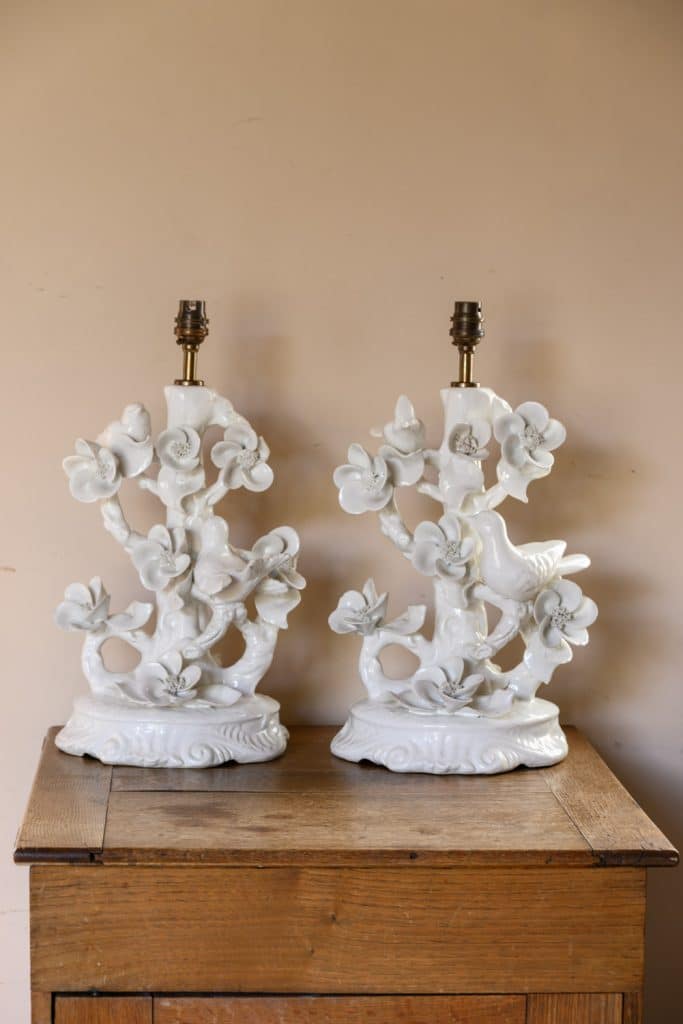 Playful pair of white porcelain lamps, mid-20th century, with songbirds and flowers.