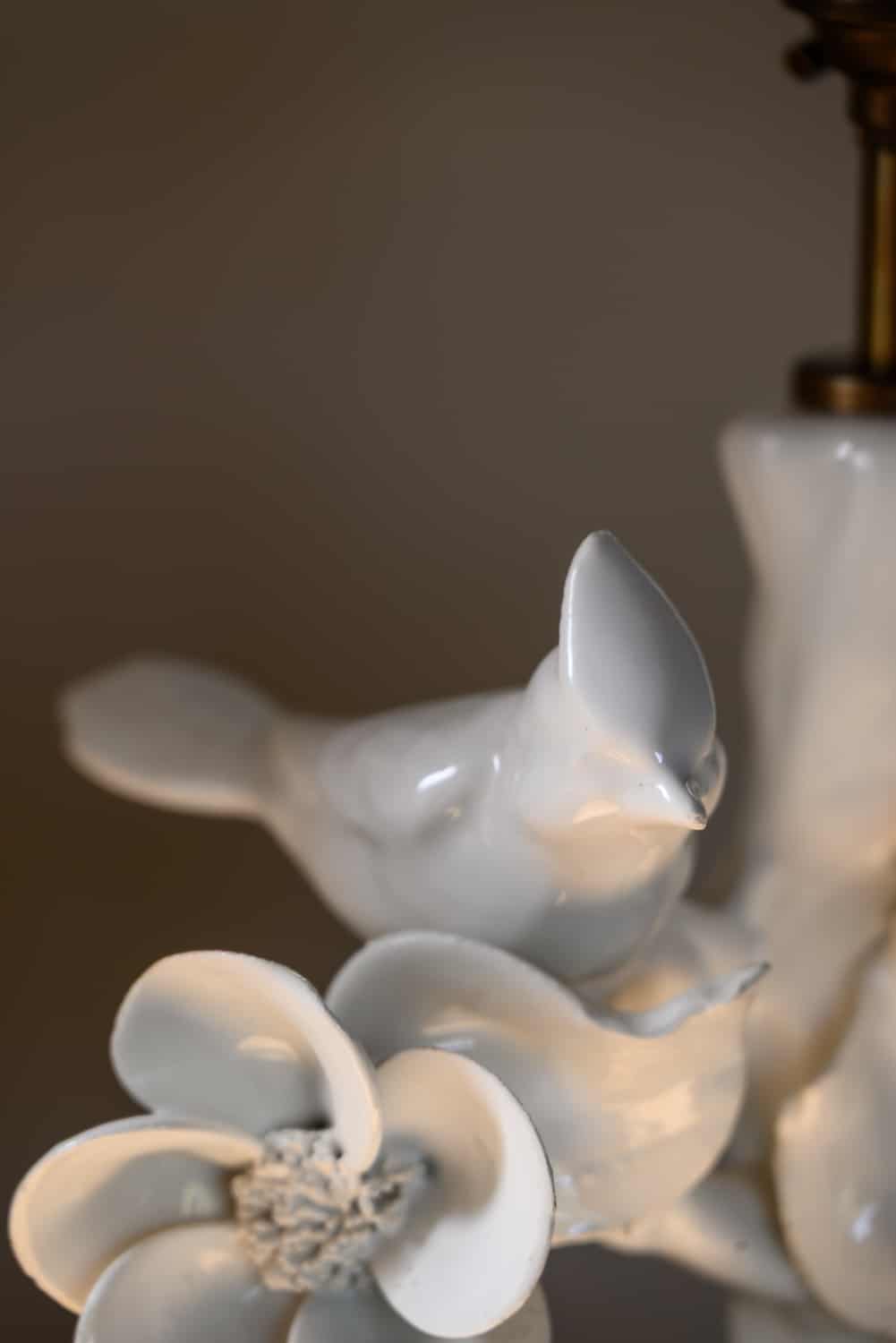Playful pair of white porcelain lamps, mid-20th century, with songbirds and flowers.