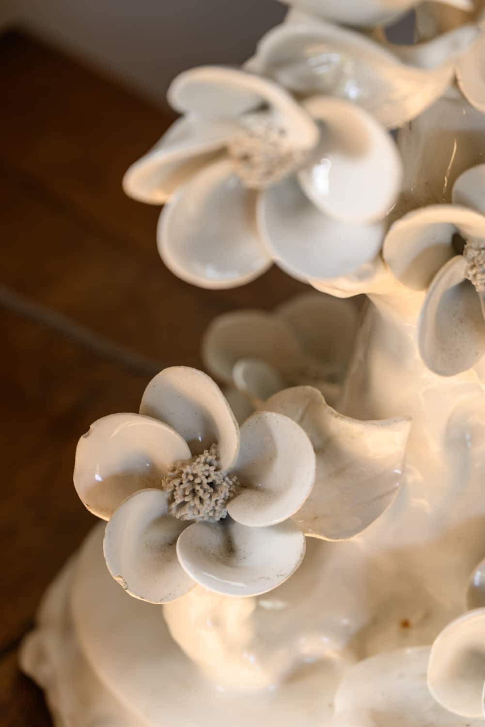 Some minor chips and lossage to extremities. The top left bird on one lamp is missing its tail, visible only from behind.