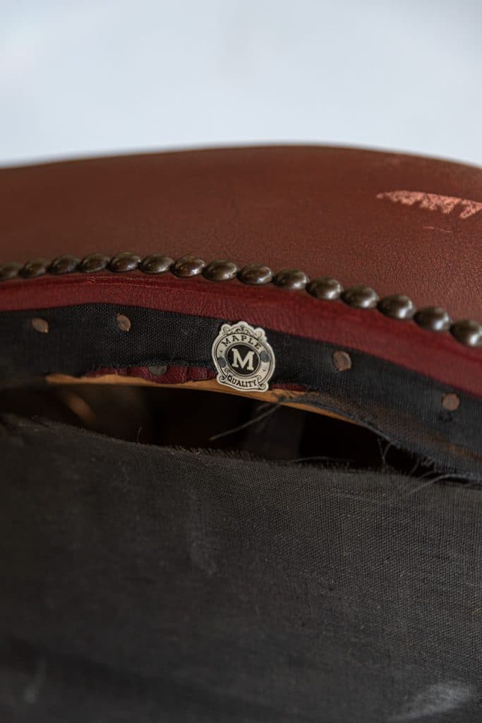 Two comfortable armchairs with burgundy leather upholstery with carved hardwood legs.