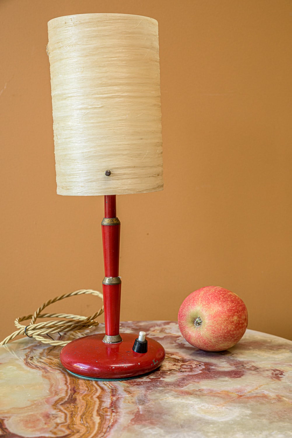Dainty Italian table lamp with brass details and shade made of spun fibre glass.