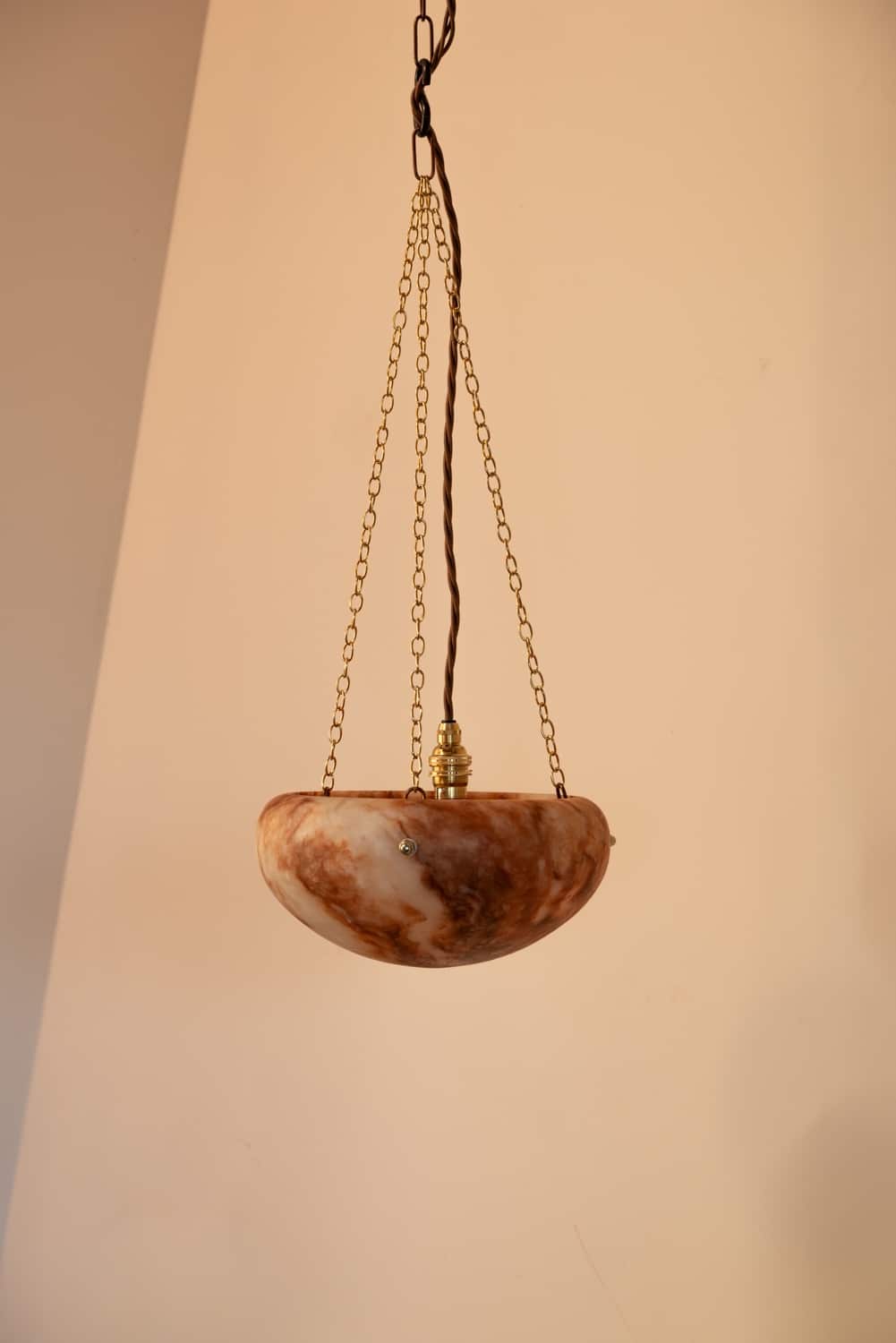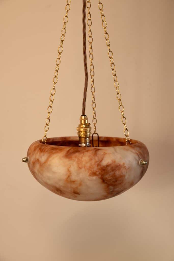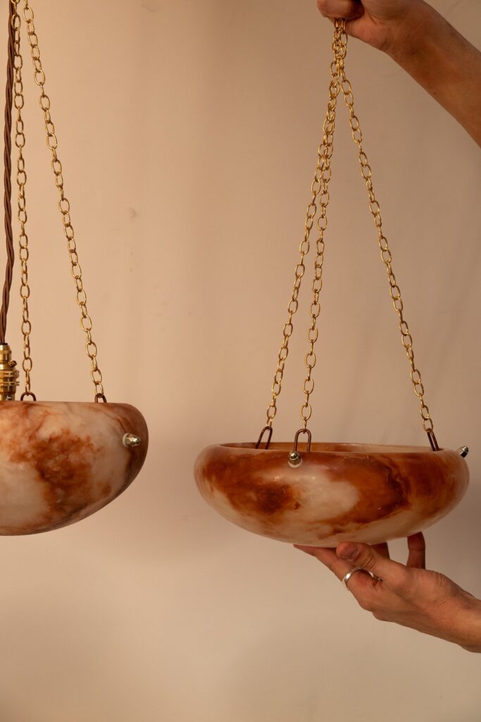 Two pink Derbyshire alabaster bowl lights, supplied on three chains with new electrics.