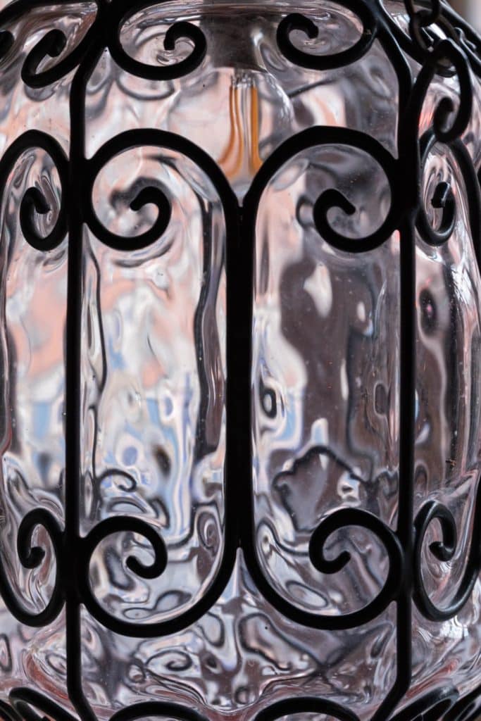 Formed by blowing glass with an ornate ironwork frame.