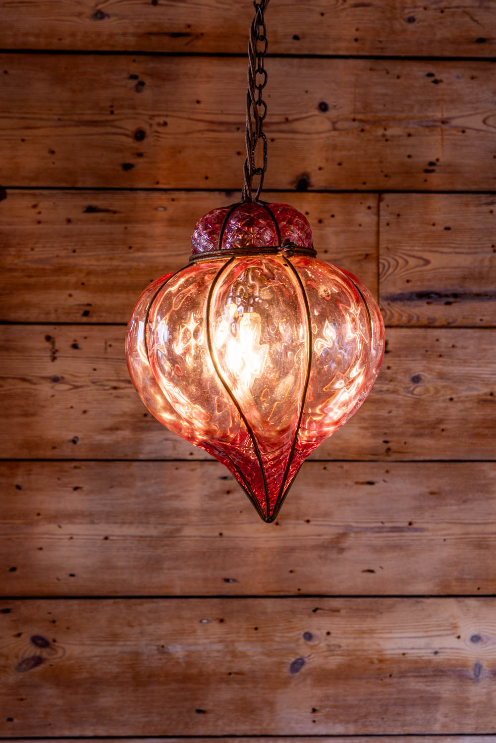 Pink bubble lantern with dimpled glass and simple brass cagework.