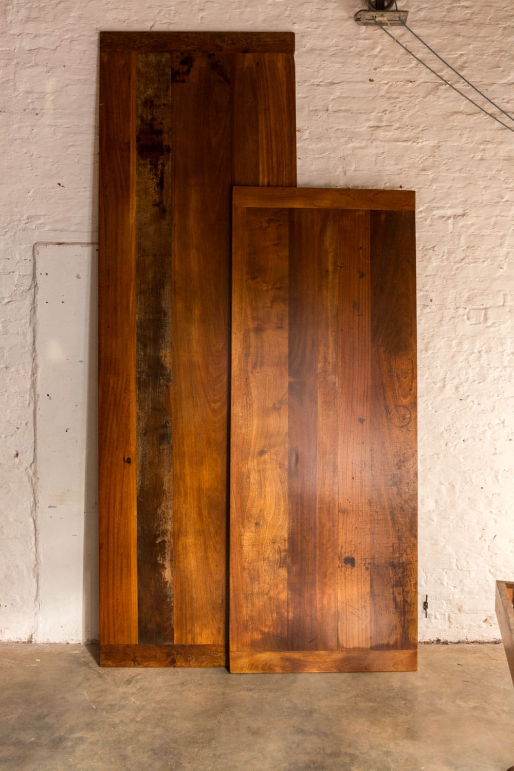 Dining tabletops crafted from reclaimed iroko chemistry benches.