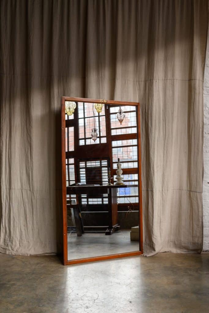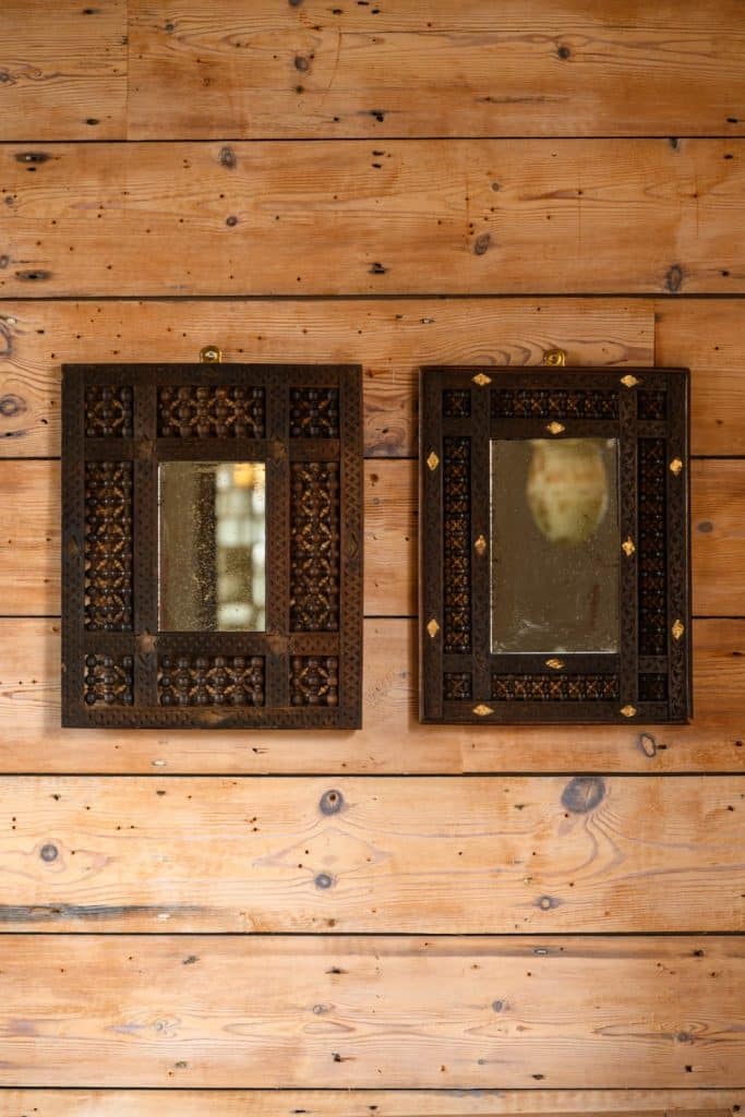 Dressing mirrors with frames made from reclaimed 19th century church pews.