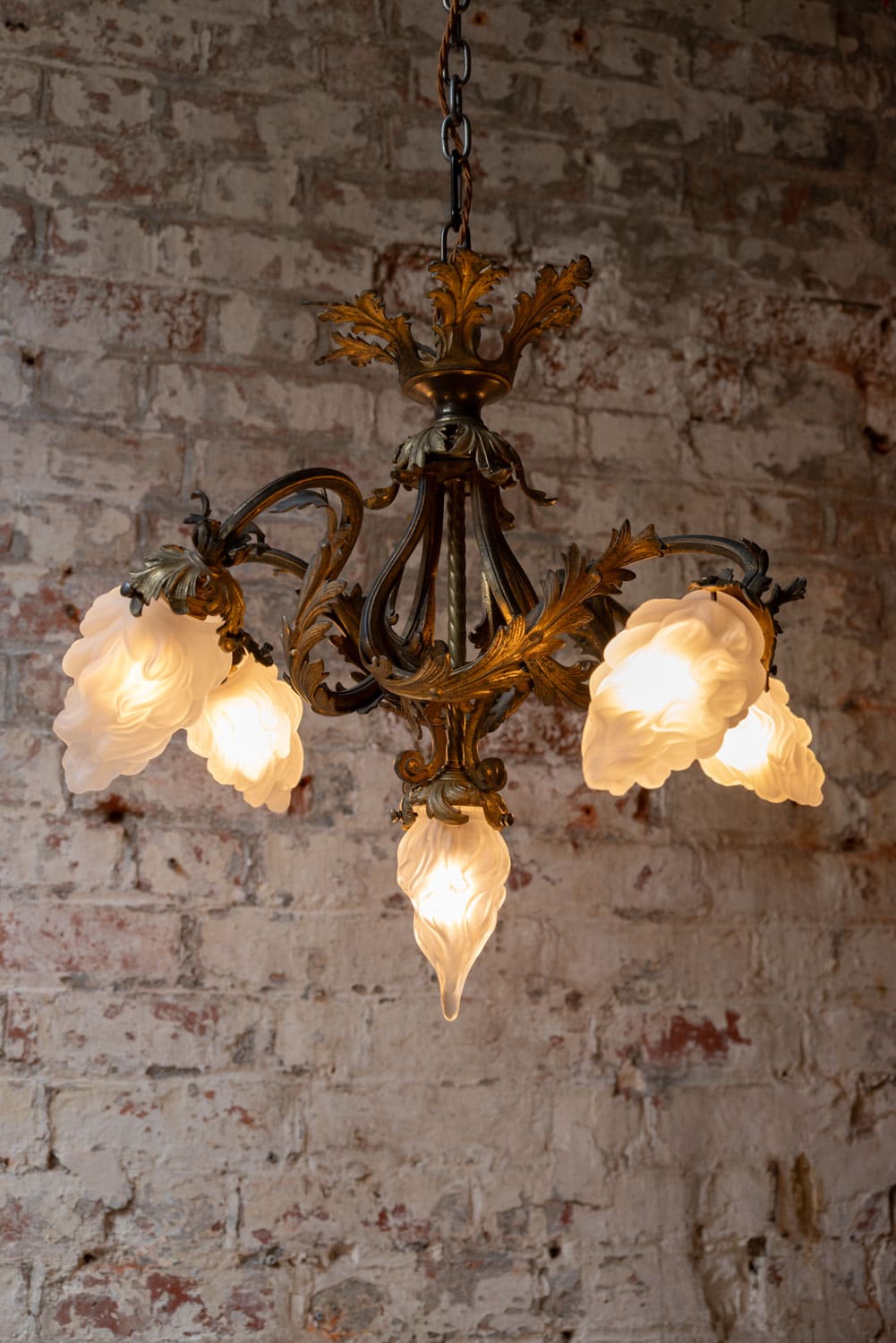 French Rococo gilt brass chandelier with angled lighting arms and glass flame shades.