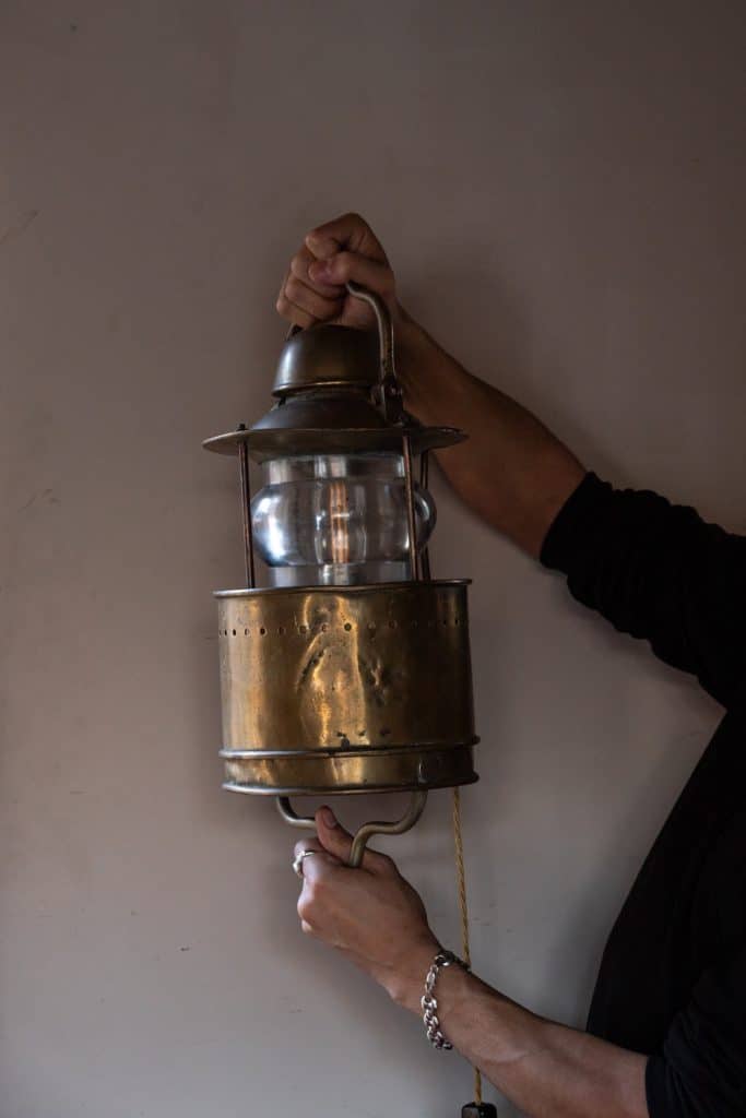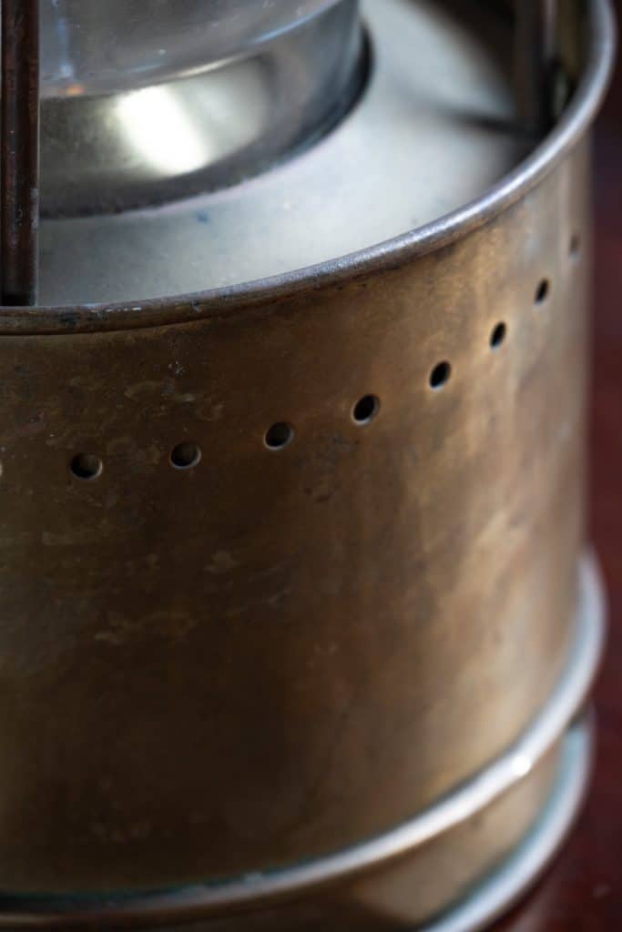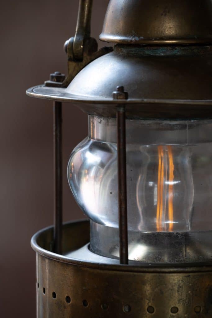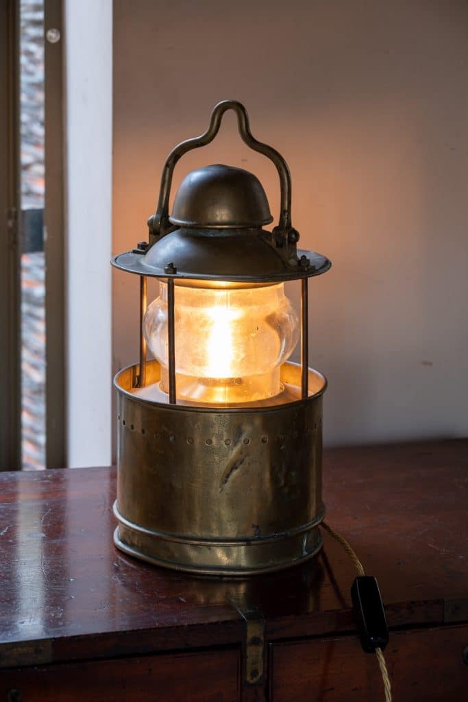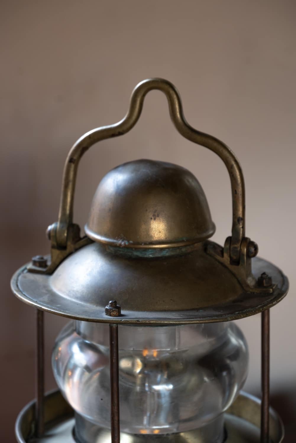 19th-century brass navigation lantern featuring a substantial magnifying glass lens.