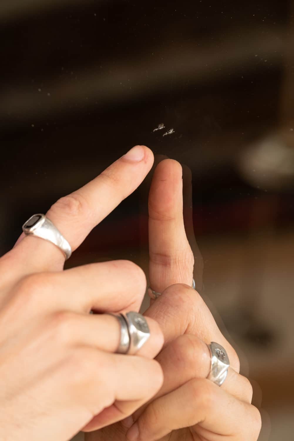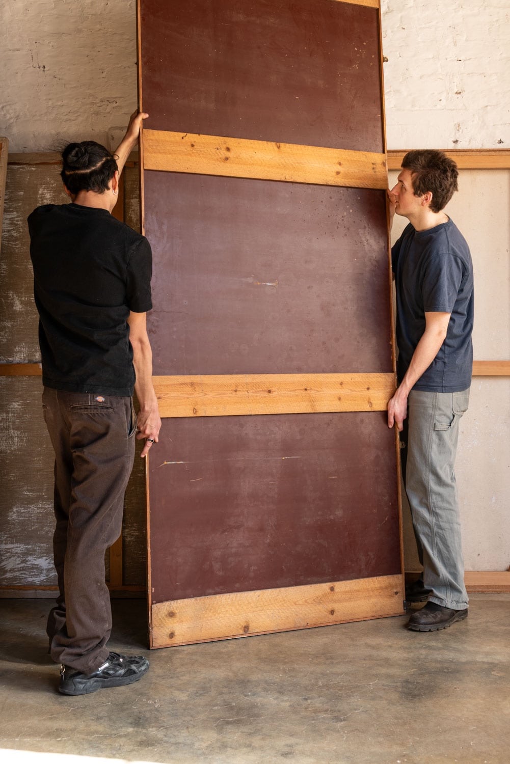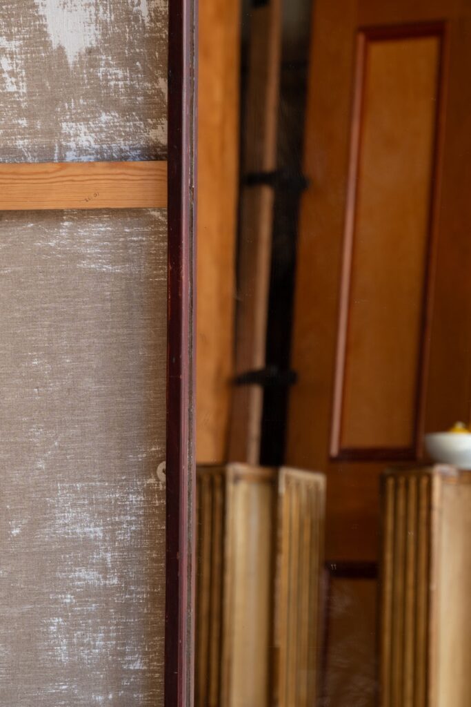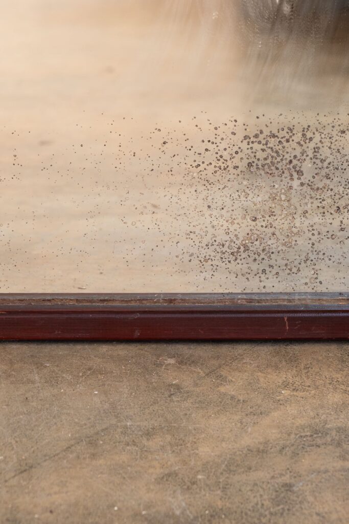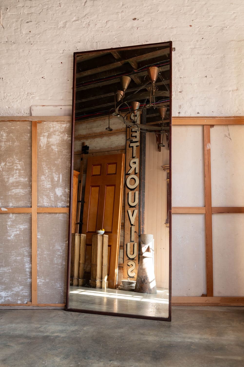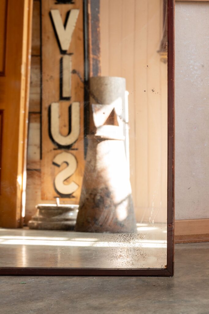 A particularly sizeable shop mirror, c.1950, with a thin frame and light foxing on the plate.