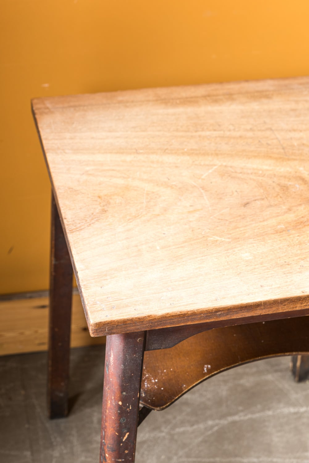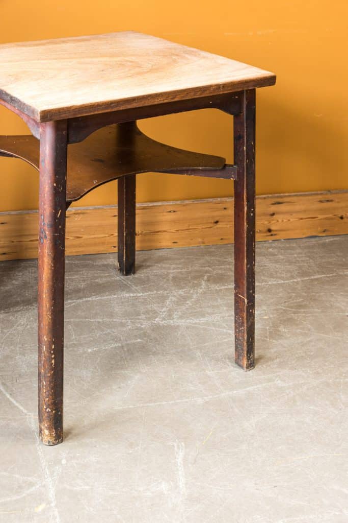 Vintage square pub table with a hardwood top and fitted shelf.