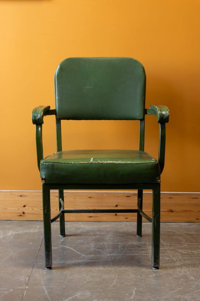 Midcentury industrial armchair from Dare Inglis with green faux leather upholstery.