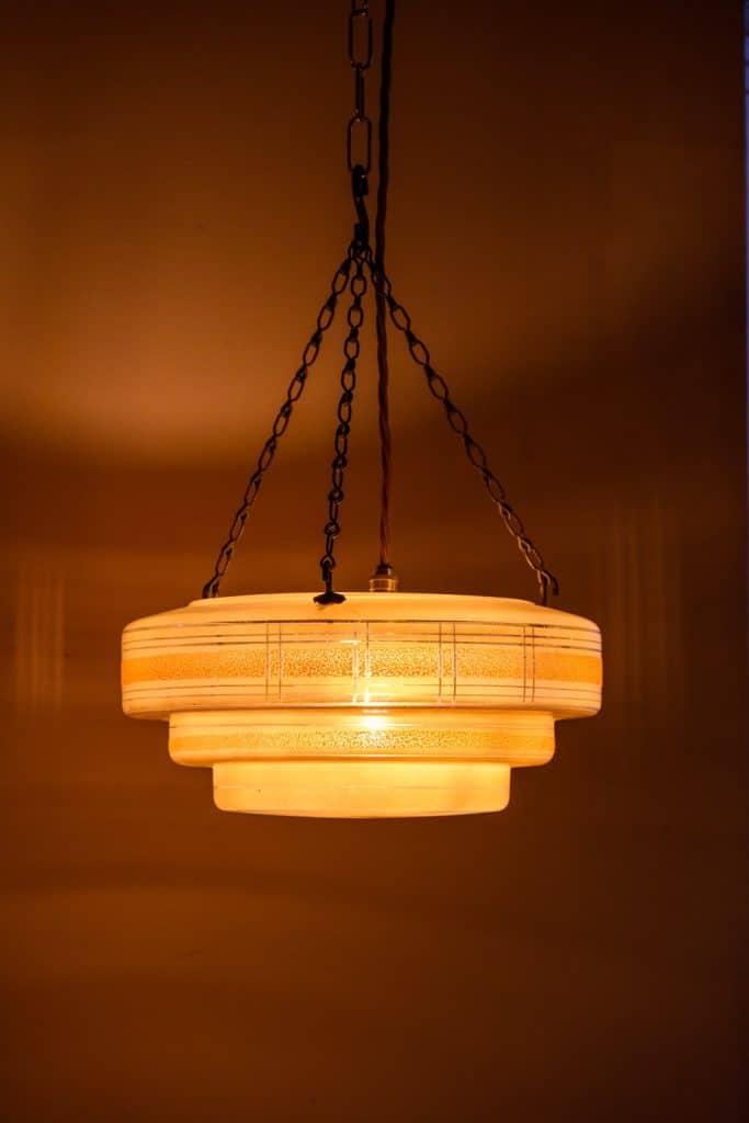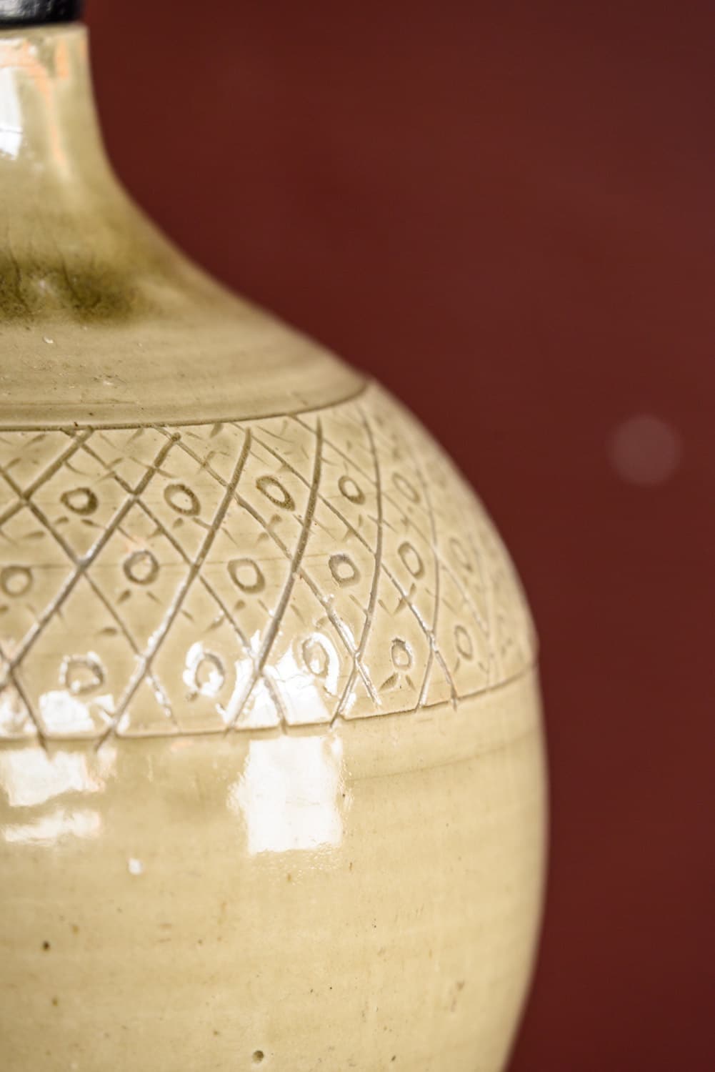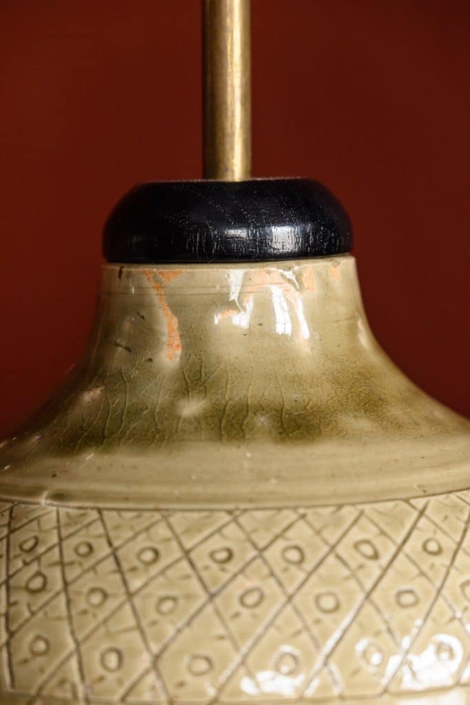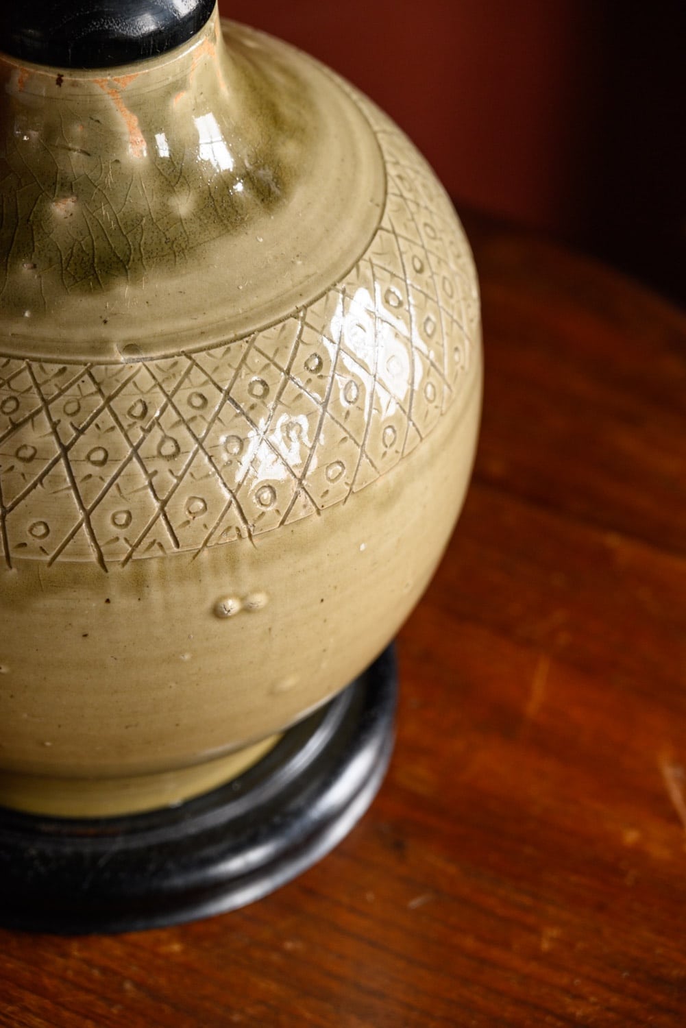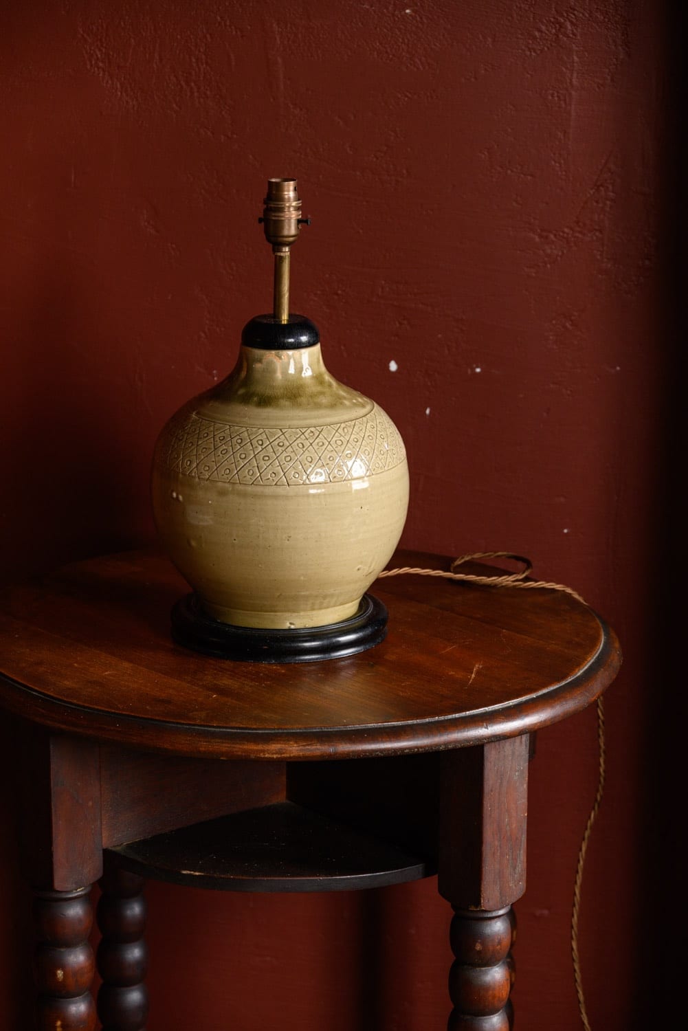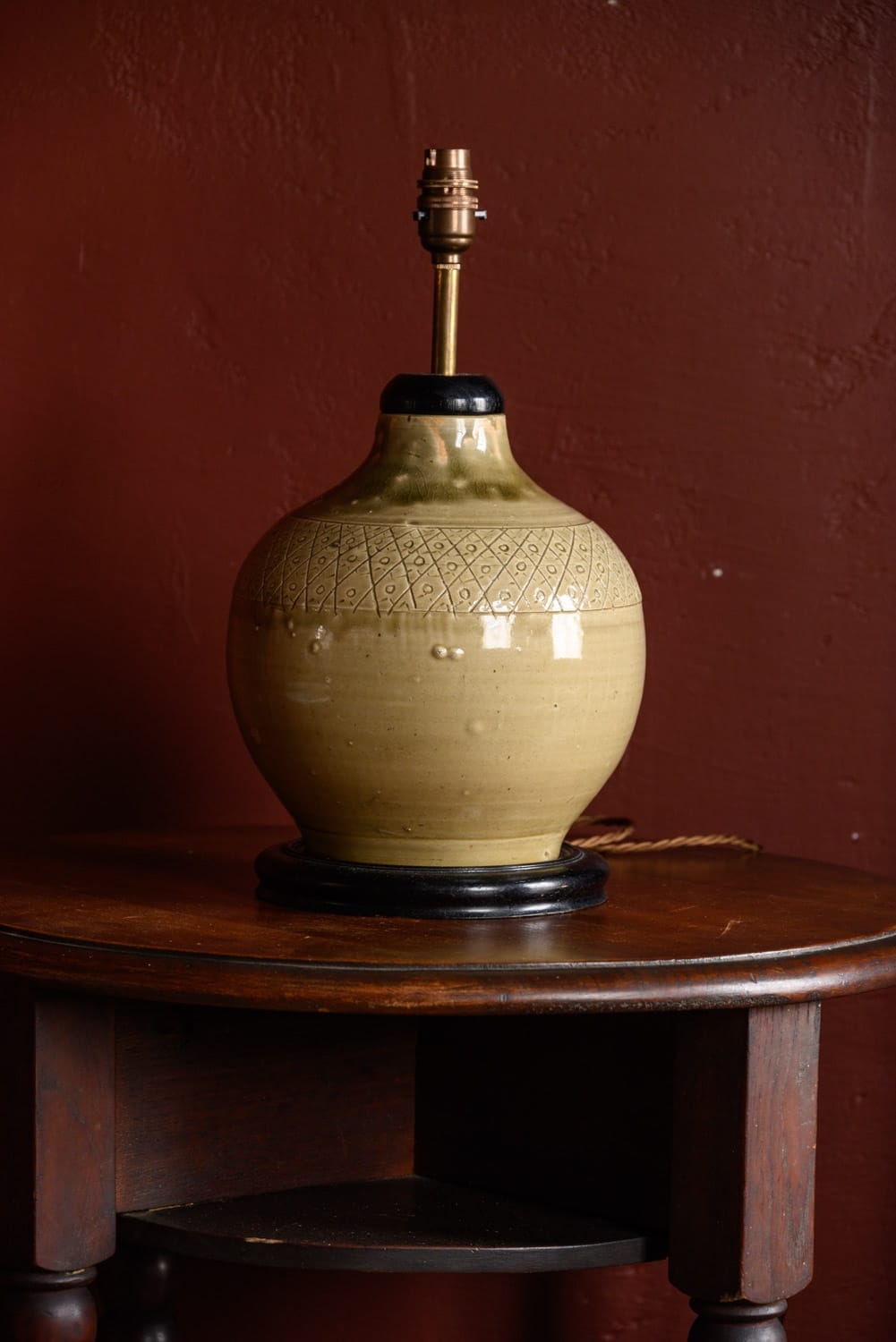Green-glazed studio pottery lamp with incised decoration and bulbous form.
