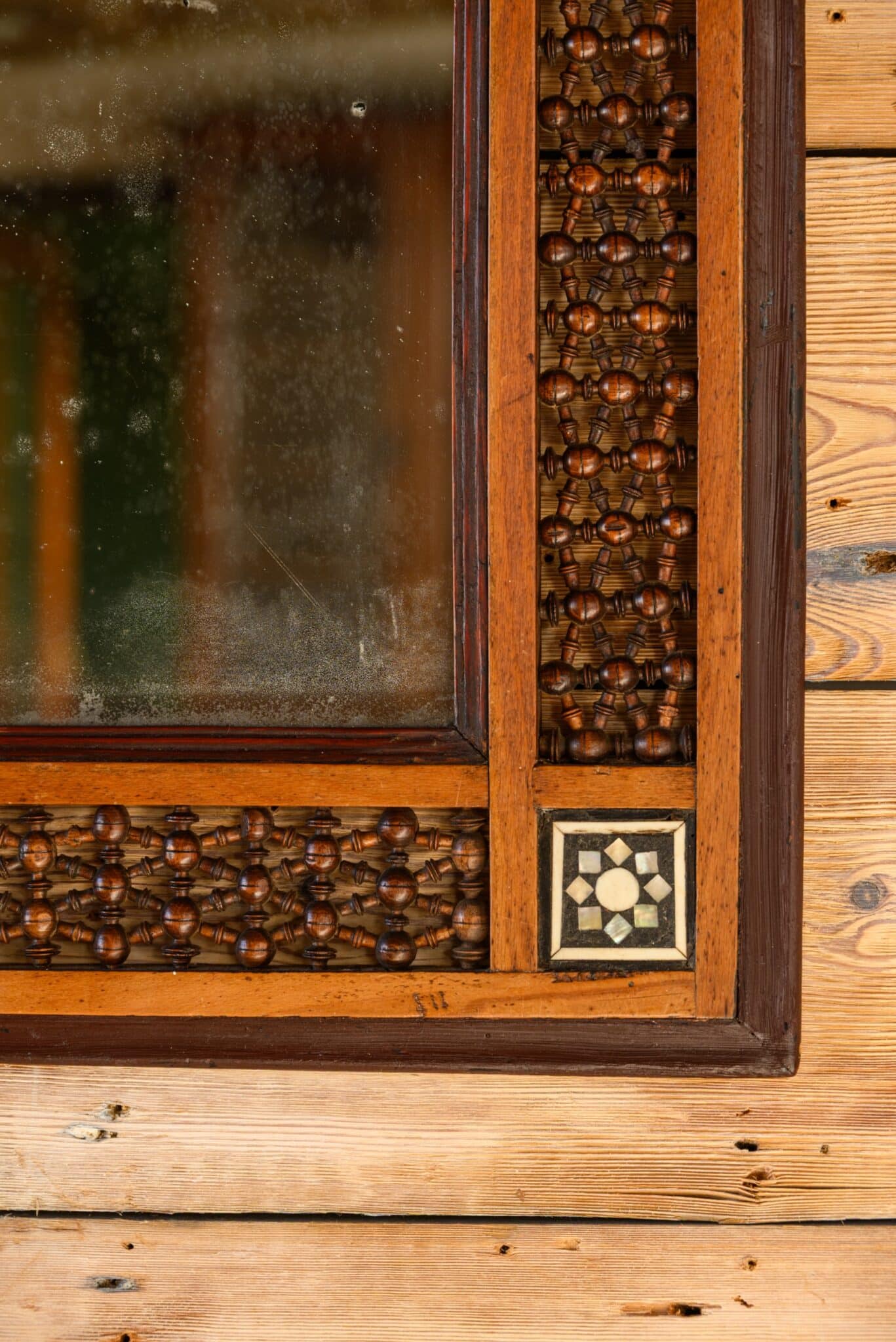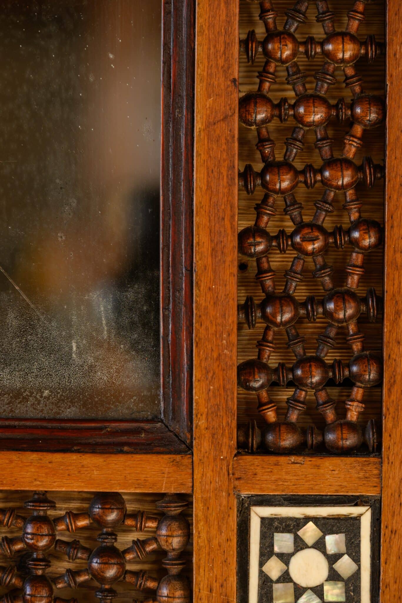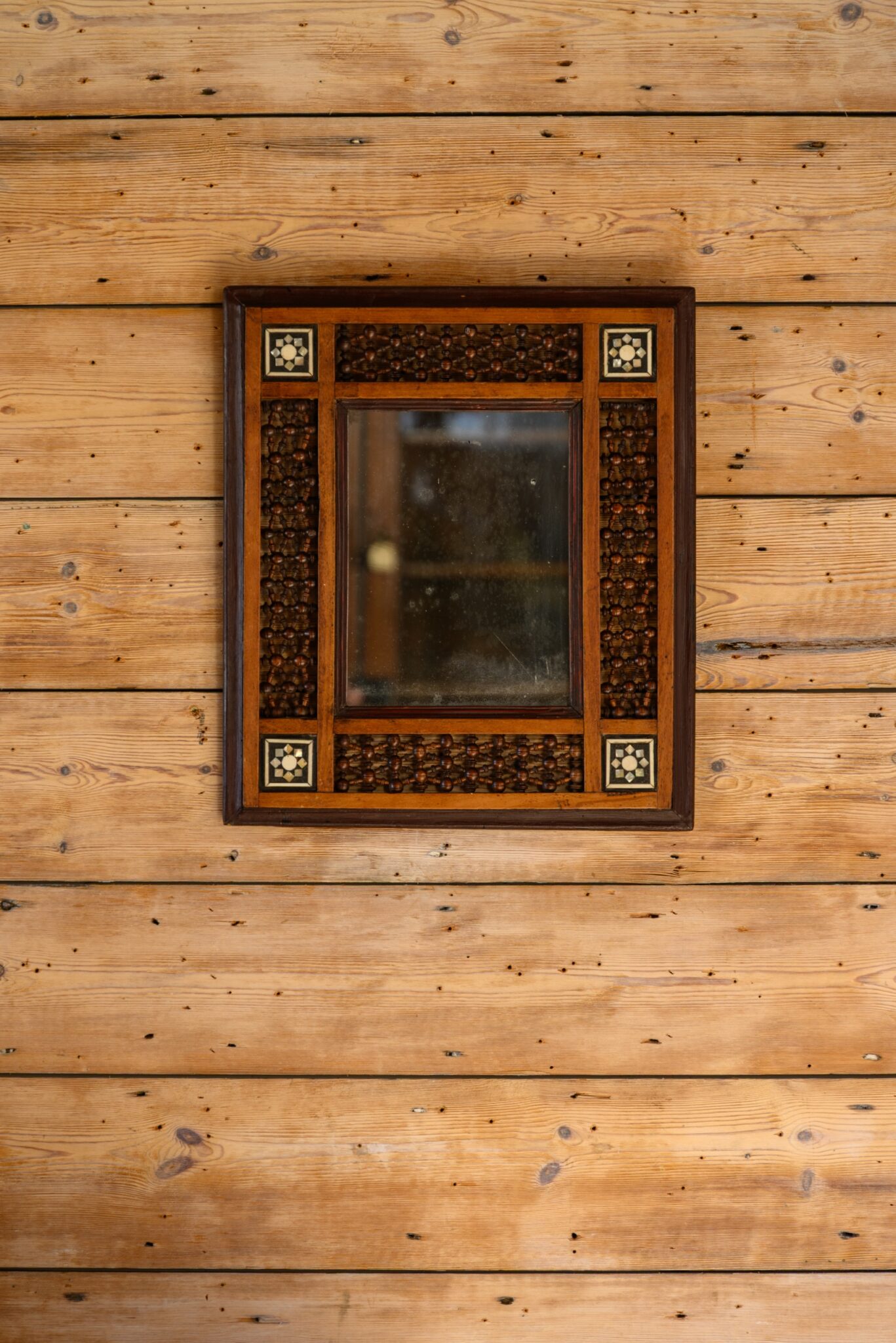 Syrian mirror with intricate frame and fine bone and mother-of-pearl inlay.
