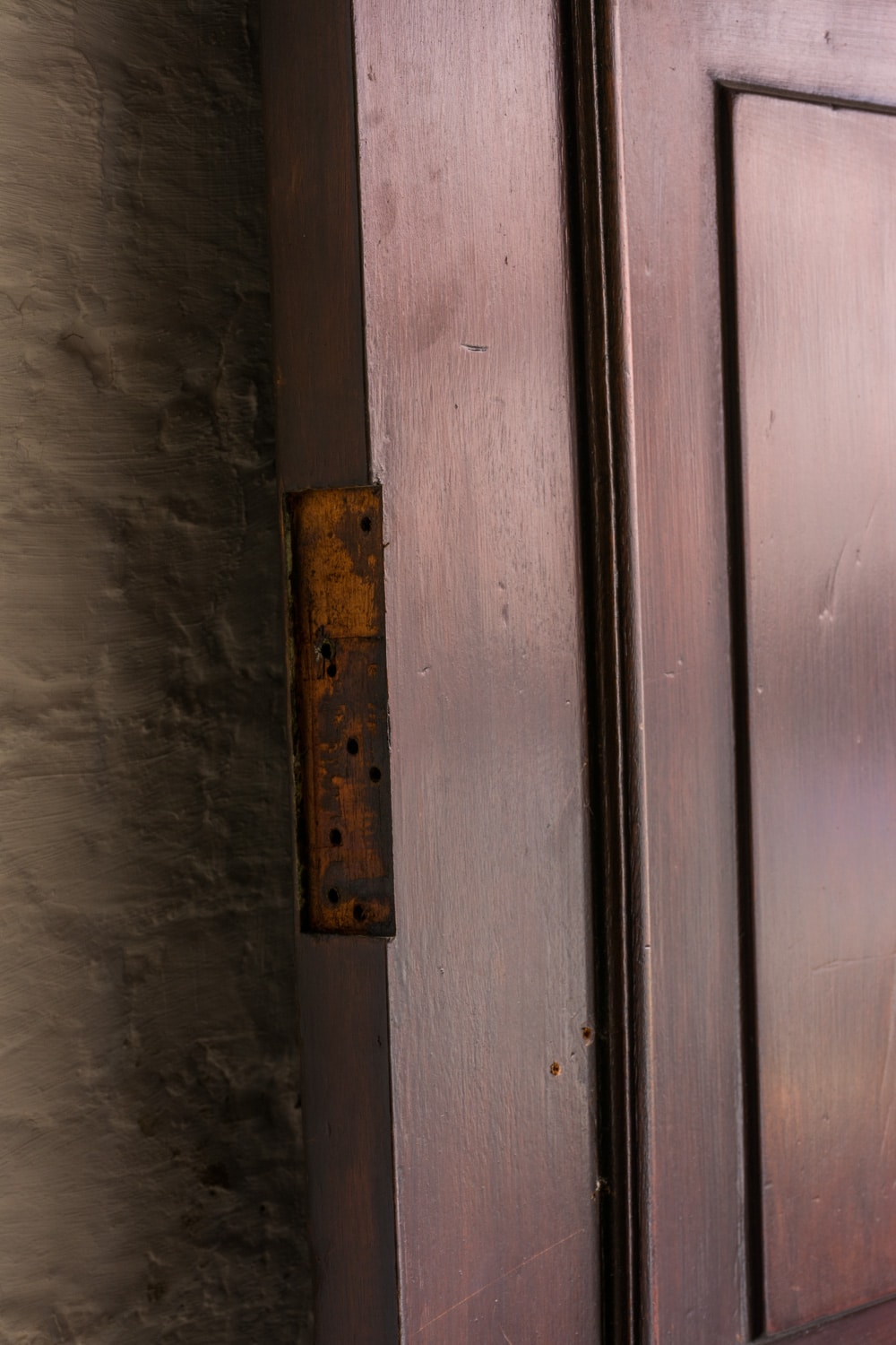 A pair of oversized hardwood doors with square panelling, removed from a commercial building.