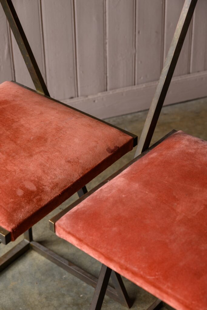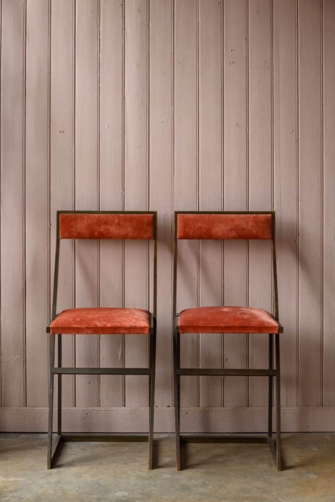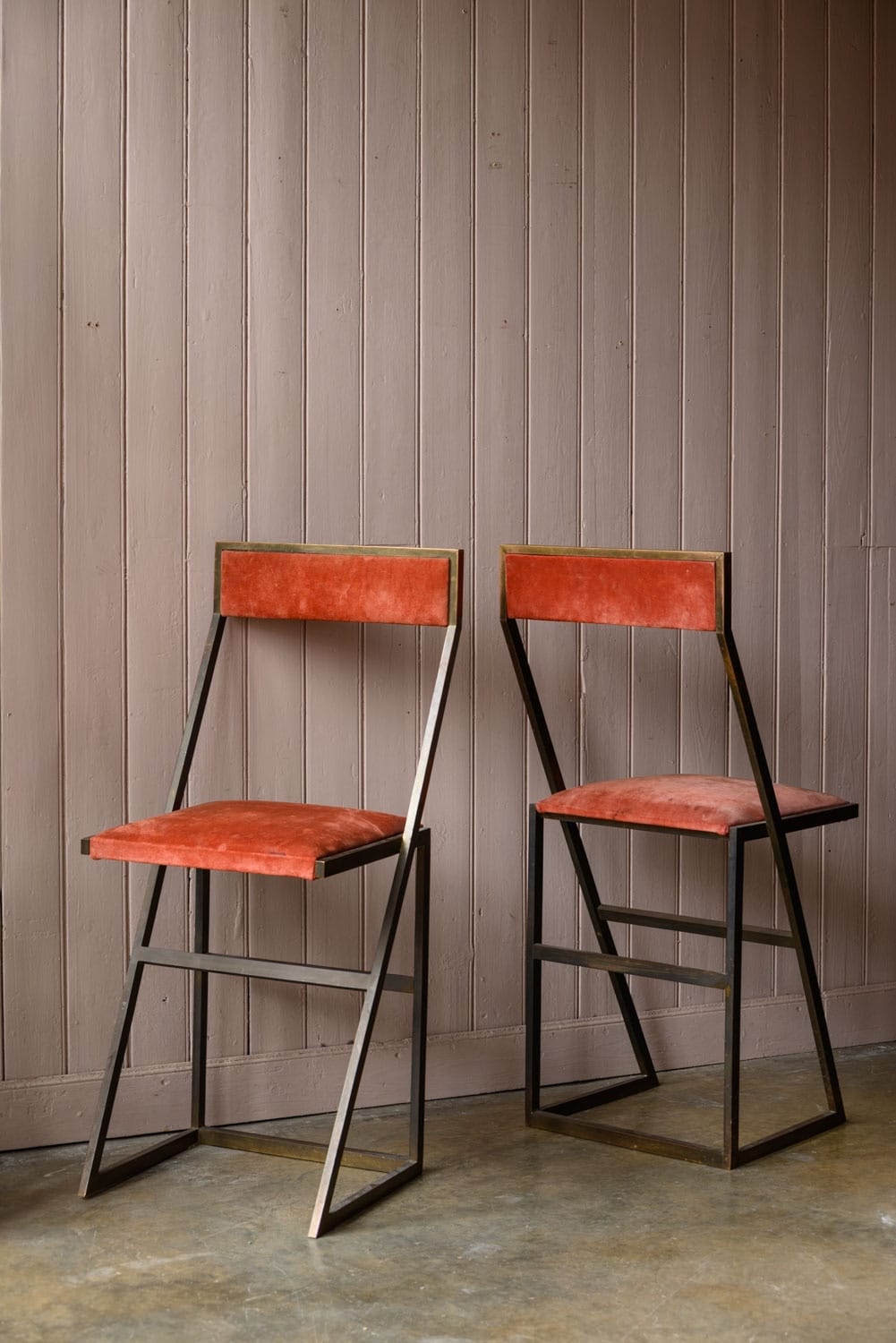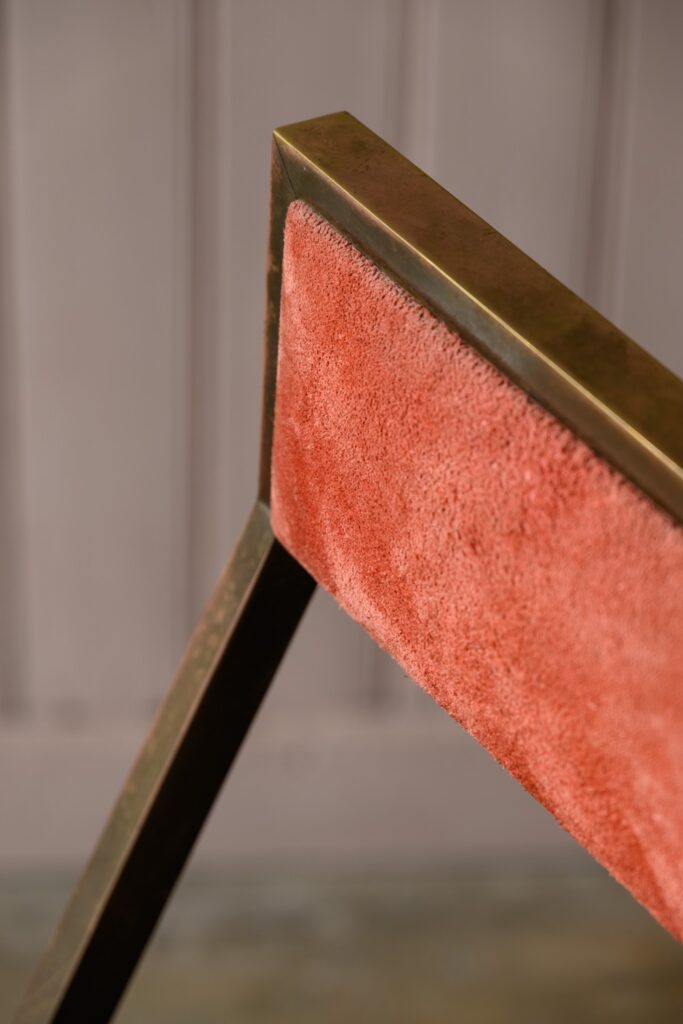 Brass bar stools with coral suede upholstery.