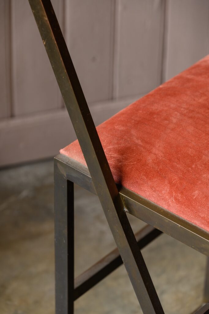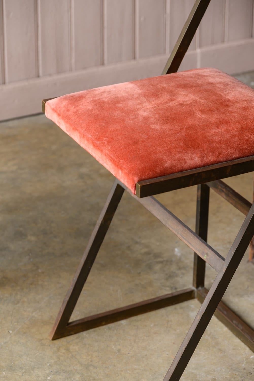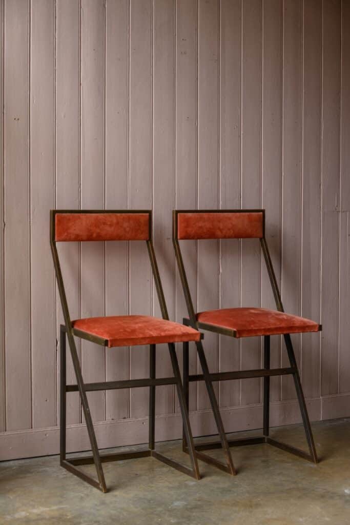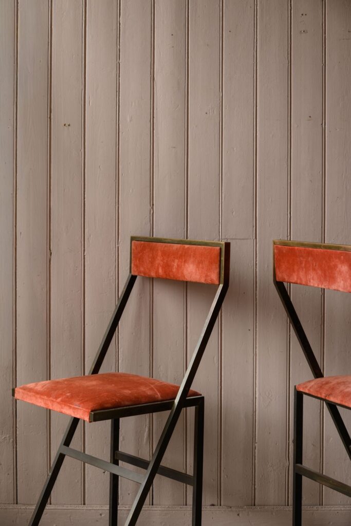 Brass bar stools with coral suede upholstery.