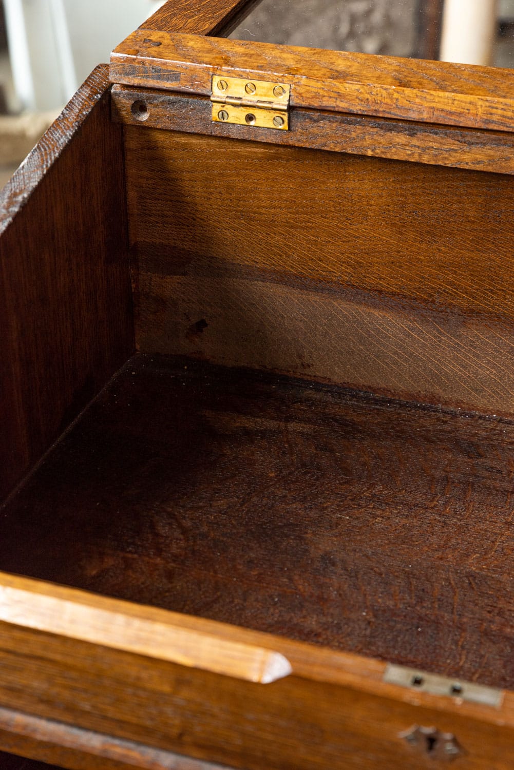 A vintage display trolley with four glazed compartments on top and shelving below.