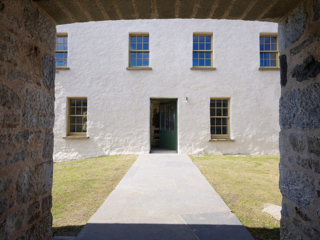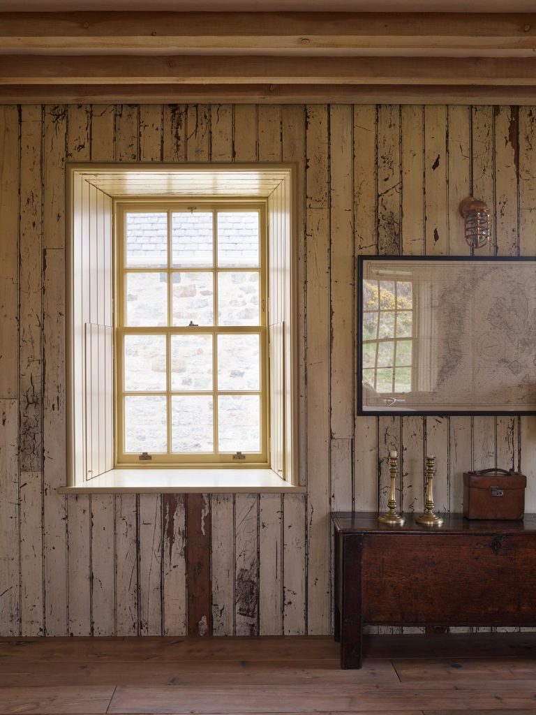 “The loss of the interior offered an opportunity to do something contemporary inside in a way that speaks the same language (as the appearance seen in Daniell’s painting of Rodel in 1818). Reorientating the entrance to its original position on the east side allowed the ground floor to be opened up as an informal L-plan sitting/dining/breakfast room, generously lit rot south and west and with the kitchen divided off by a glazed screen. The compromise was a narrow hall and staircase but the lovely play of light through the 12 pane sashes onto lime washed walls prevents the house ever feeling dark or cramped.