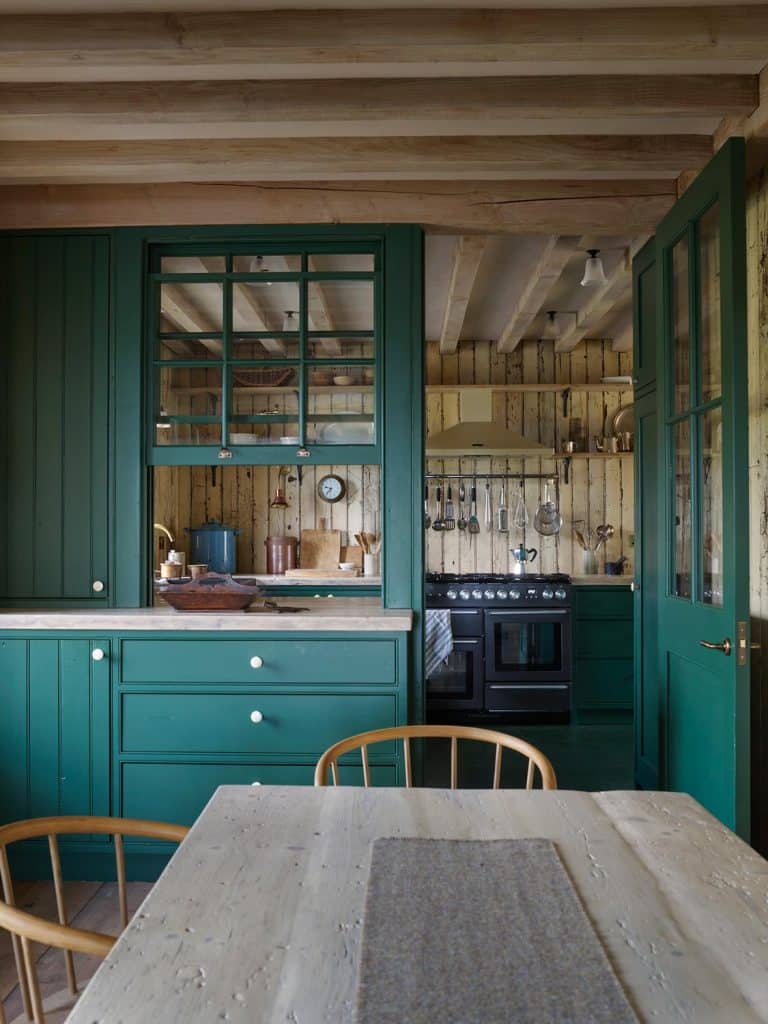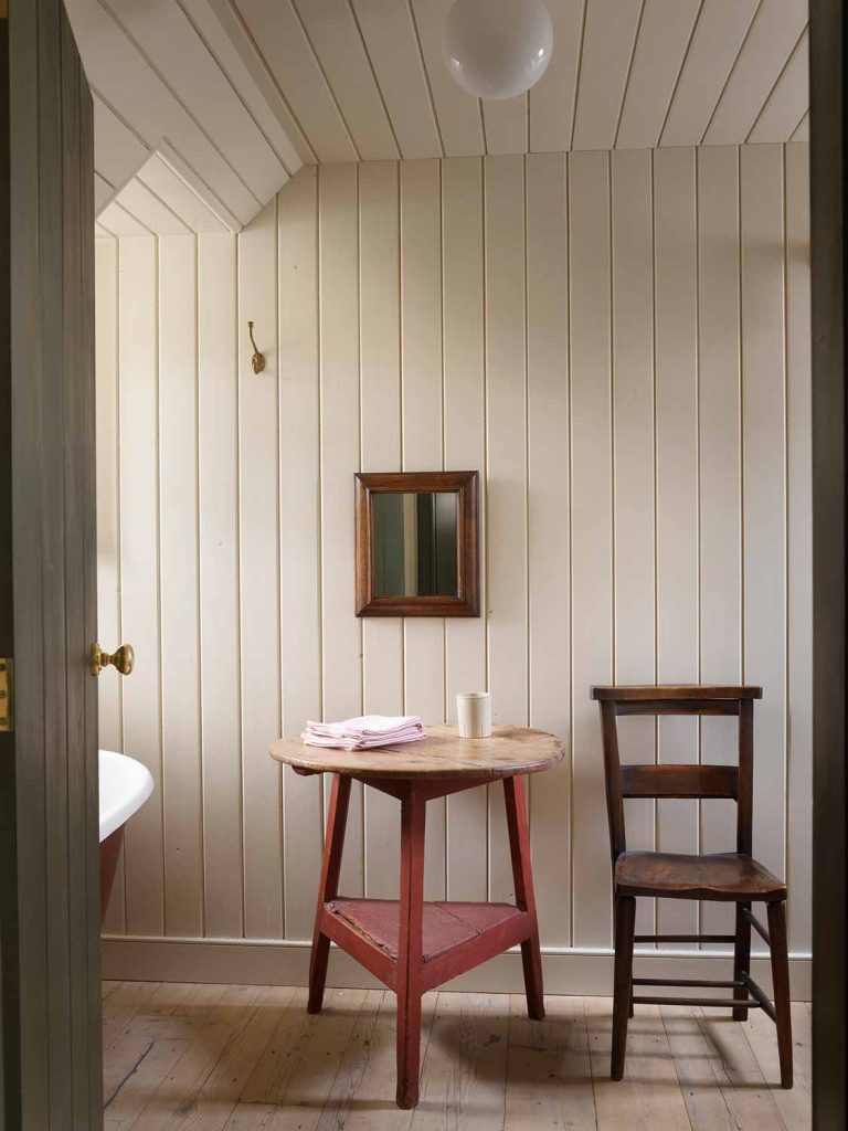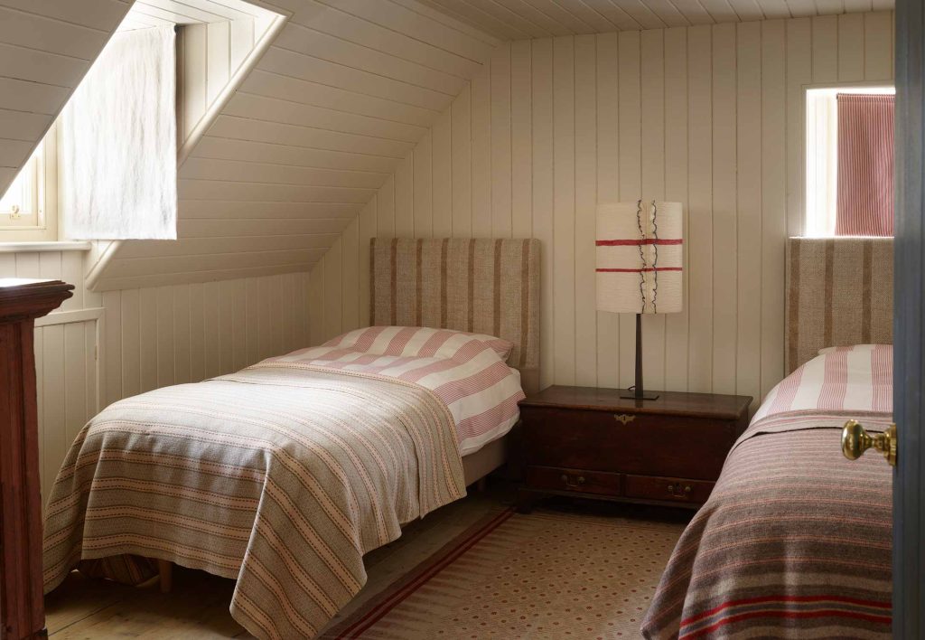 Wood, expertly crafted by joiners Angus and Iain Alec Macleod, is the defining feature, fusing the worlds of wainscoted laird’s houses, ships’ cabins and contemporary eco design. Exposed ceilings of larch and fir combine with various salvaged timbers. The ground-floor gathering room is lined with distressed bead and butt from an old mill, the partition in the Balranald Bedroom from a gymnasium floor.”