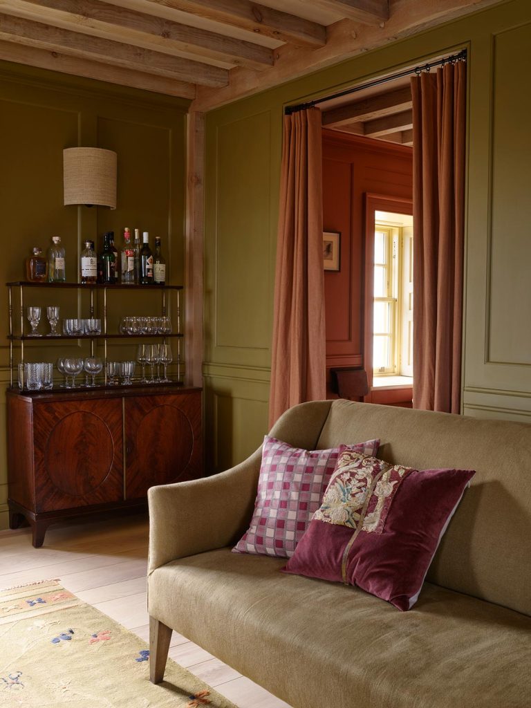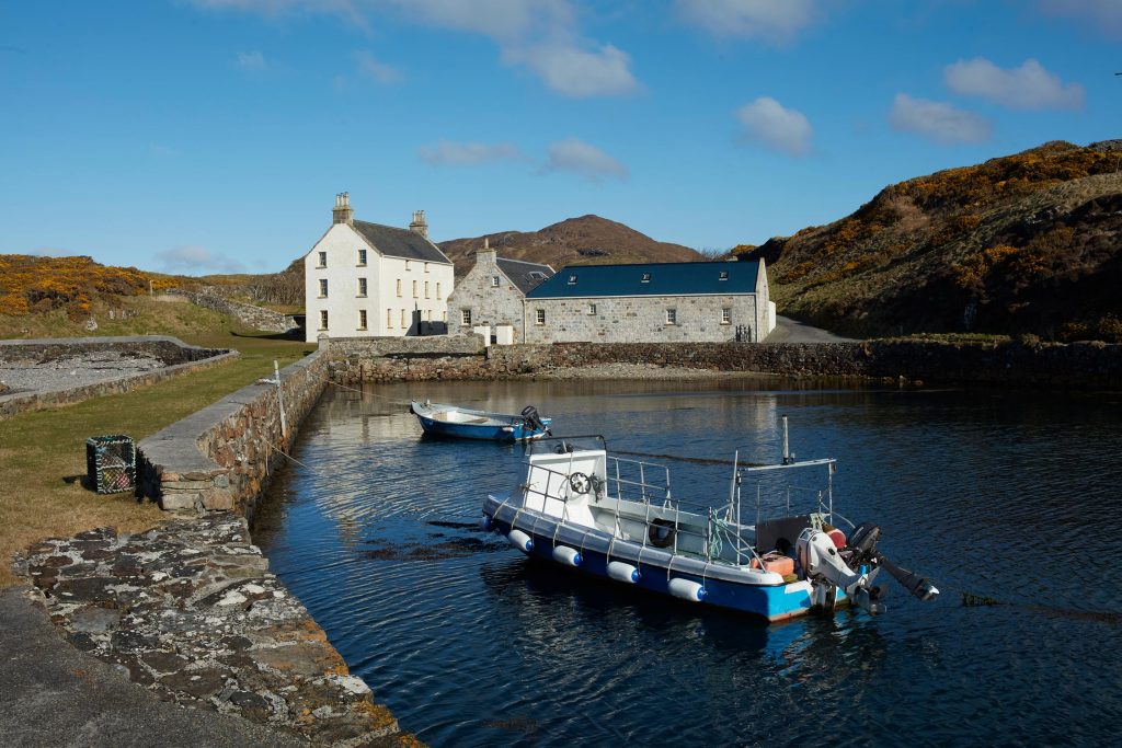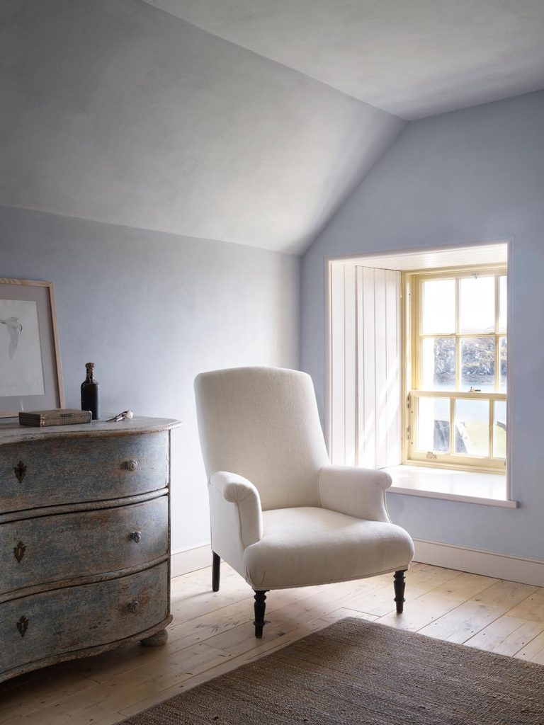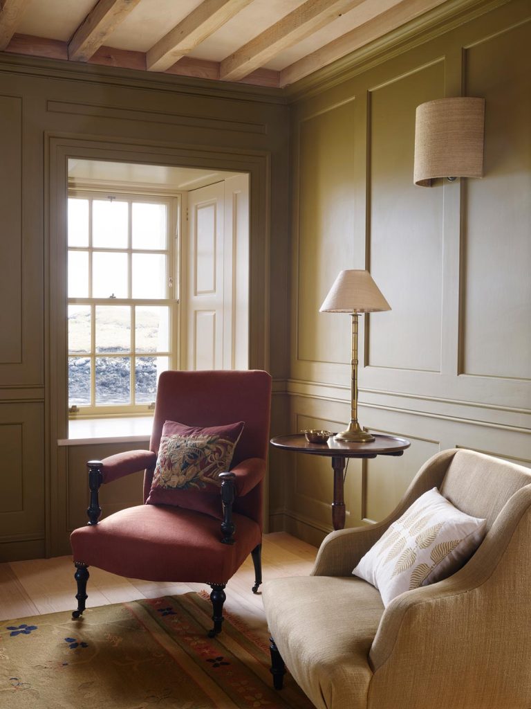 Our palette is inspired by the salt seared landscape, lichened rocks, seaweeds and mosses, hill grasses and gorse. Various gathering rooms, robust but elegantly welcoming use sturdy corduroys and wools, with nooks to enjoy views or a dram.