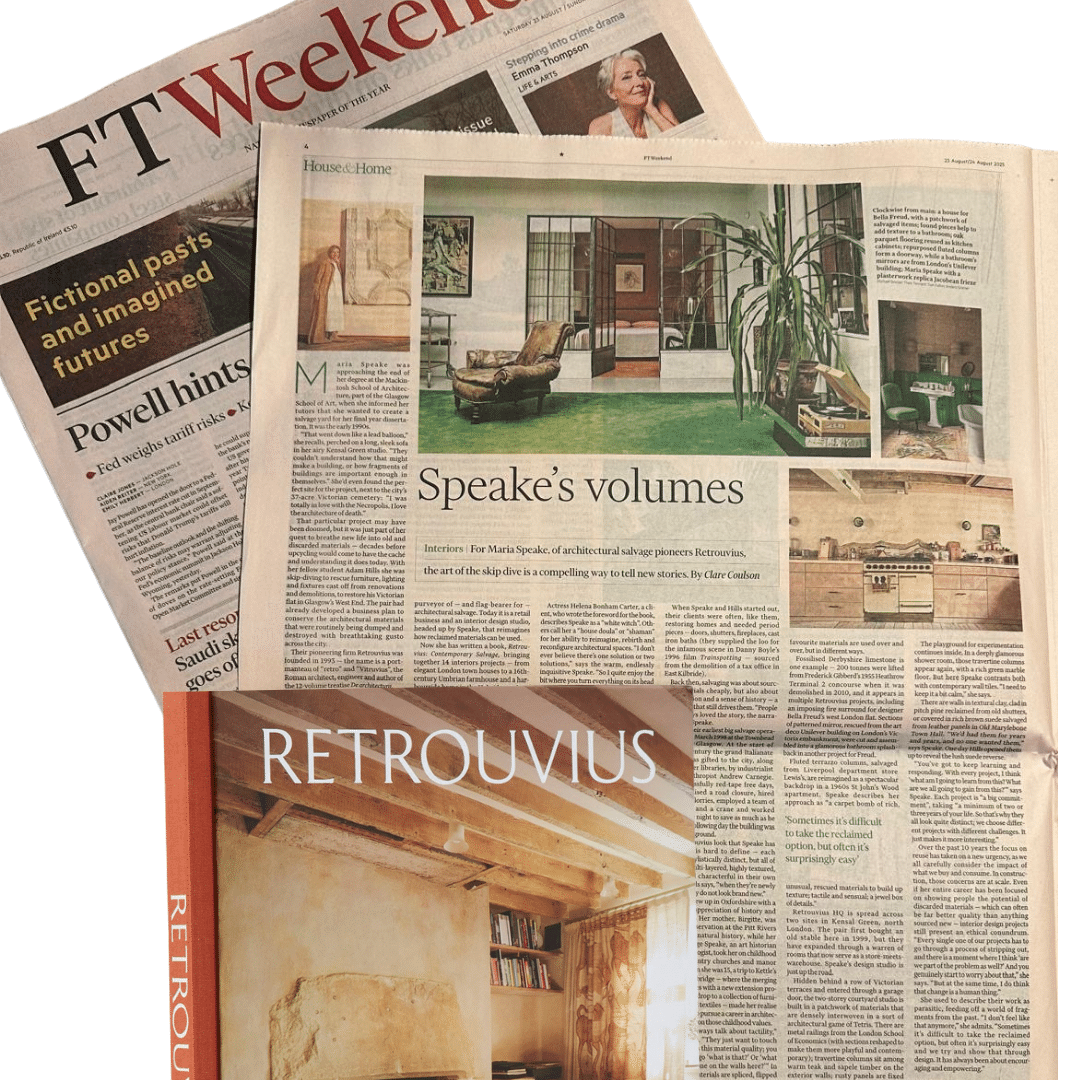 In “Speakes volumes” for the Financial Times, Clare Coulson revisits the early days of Retrouvius – what she calls “the art of the skip-dive” – and traces how those beginnings shaped the design philosophy we hold today. She beautifully captures how Retrouvius’s approach to reuse, has become “a compelling way to tell new stories”, revealing the narrative at the heart of our book.