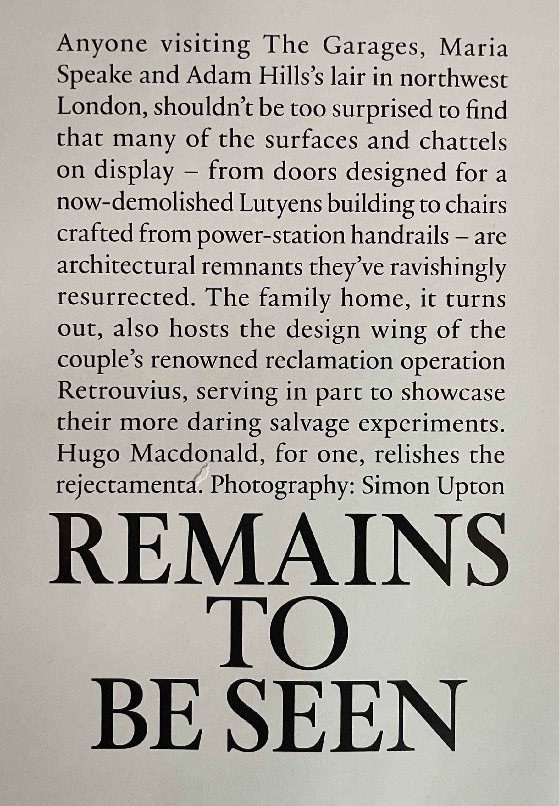 “Remains to be Seen”, was the title for Hugo Macdonald’s piece in The World of Interiors, in which he beautifully framed our philosophy of reuse “as an ongoing experiment and celebration, without a hint of parsimony”.