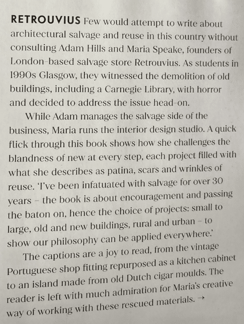 About our projects (of which 14 are featured in our book), he said they “go beyond prudent circularity; they are a celebration of beauty, texture, personality and reuse” concluding that “Retrouvius is proof that there can be an alternative way of designing, deconstructing and redesigning”.